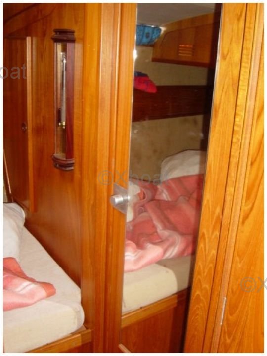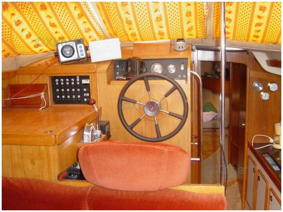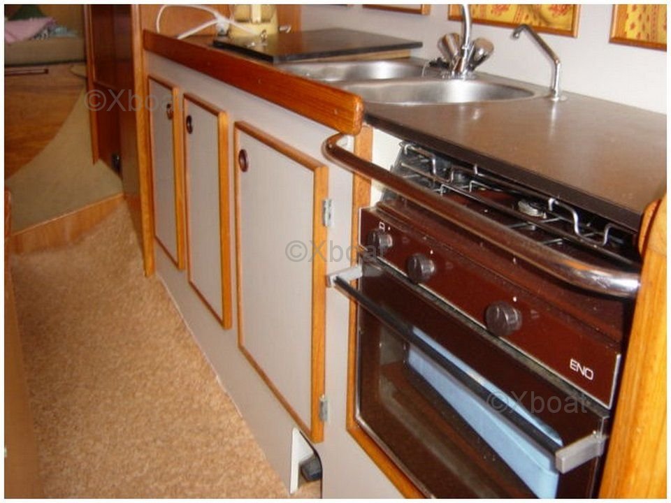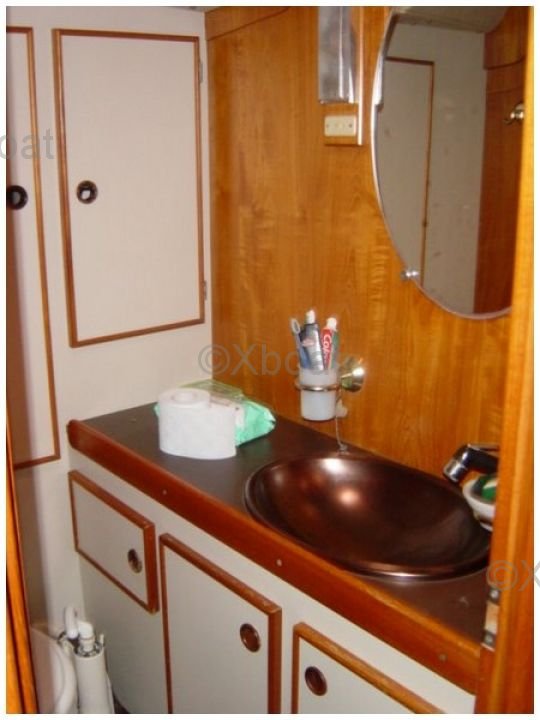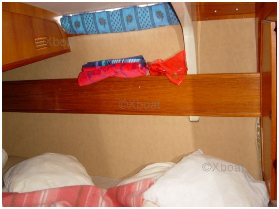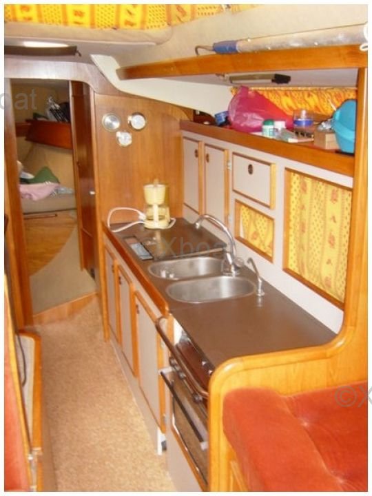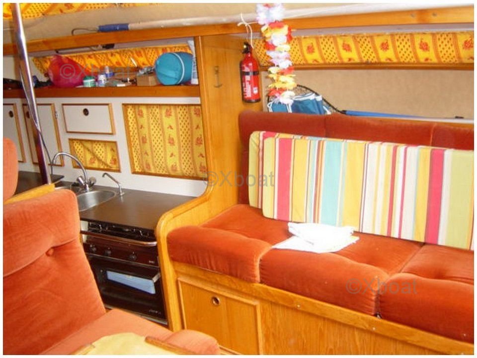 L'intérieur du bateau est spacieux et bien agencé, avec une attention particulière portée au confort des occupants. Le carré est lumineux grâce à de grandes ouvertures et offre un espace de vie convivial. La cuisine est bien équipée, et les cabines offrent un bon espace de rangement.