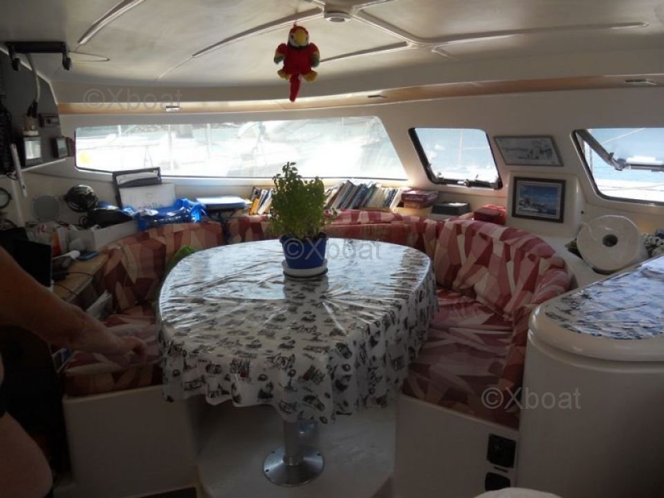 L'Athena 38 offre un aménagement intérieur convivial avec 4 cabines doubles et 2 salles de bain. Le salon est spacieux et lumineux, avec une grande table à carte et un coin salon confortable. La cuisine est bien équipée avec un évier double, un réfrigérateur et un four.