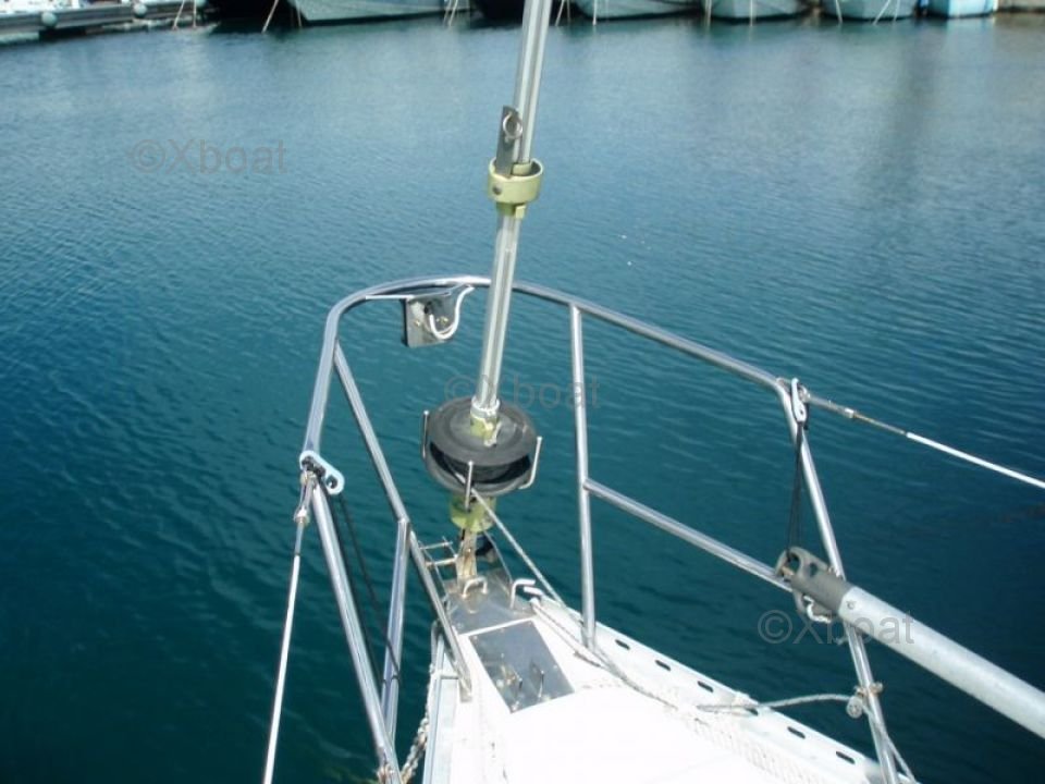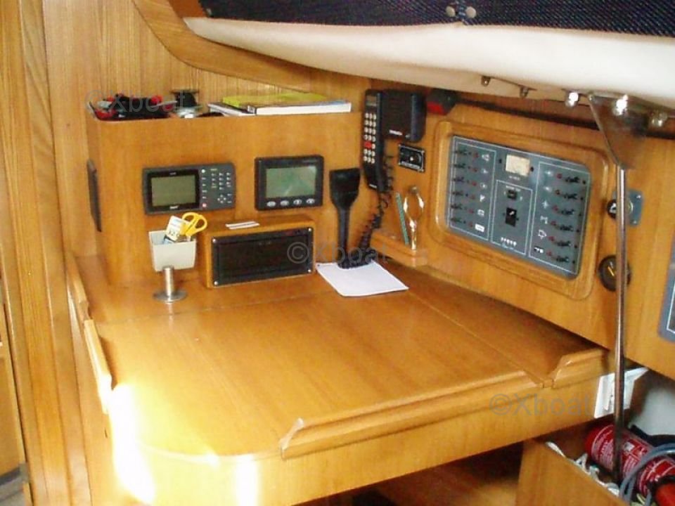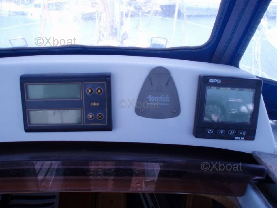 Équipements standard : Ancre, guindeau électrique, pilote automatique, GPS, VHF, compas, sonar, échosondeur, batterie de service, batterie de démarrage, panneau solaire, générateur éolien
