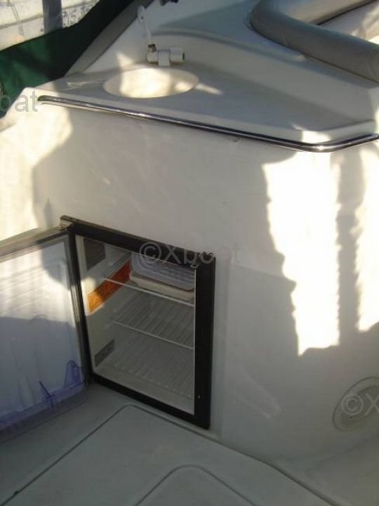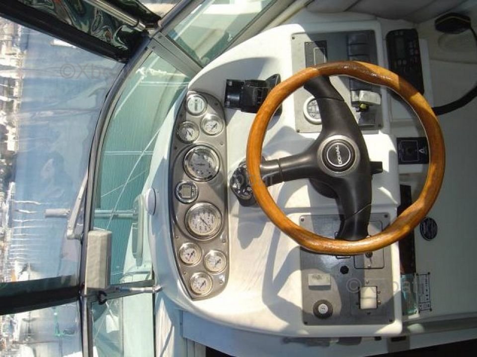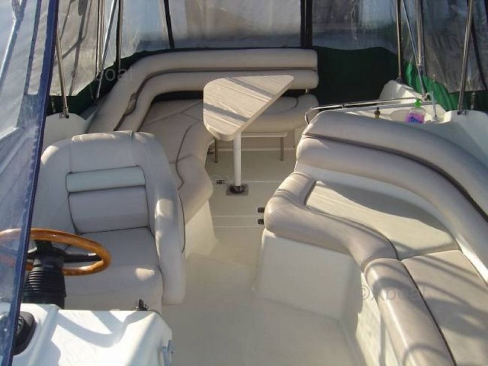 Le cockpit est spacieux et bien conçu pour accueillir plusieurs pêcheurs, avec des sièges confortables et des espaces de rangement pratiques. Le pont est équipé de plusieurs supports pour cannes à pêche, ainsi que d'un poste de pilotage ergonomique.