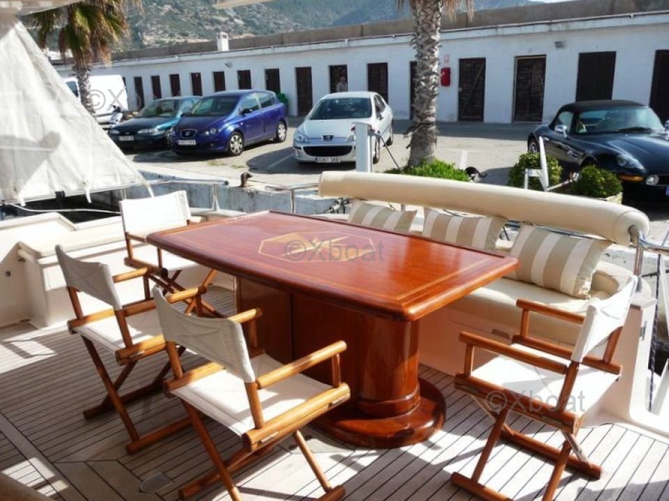 Le pont principal offre un espace de vie extérieur confortable avec une zone de repas, un salon et un espace de détente. Le pont supérieur est équipé d'un jacuzzi et d'un solarium, offrant une vue imprenable sur l'horizon.