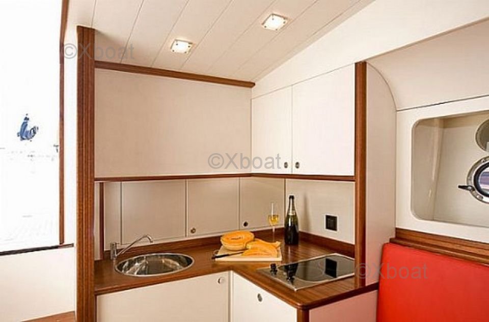 Voilure: La surface de voilure totale est de 105 mètres carrés, ce qui permet de naviguer efficacement dans diverses conditions de vent. Le gréement est en sloop, offrant une grande simplicité d'utilisation.