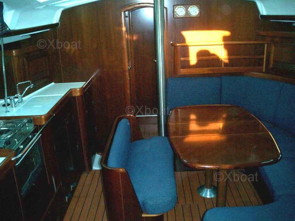 L'intérieur de l'Océanis 423 est spacieux et bien conçu, avec une disposition en trois cabines et deux salles de bain. La cabine principale est située à l'avant, offrant un espace de couchage confortable. Les deux cabines arrière peuvent être utilisées comme cabines d'amis ou comme espaces de rangement supplémentaires. La cuisine est bien équipée avec un évier, un réfrigérateur et un four à gaz.