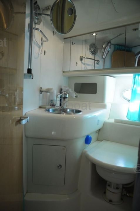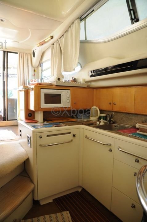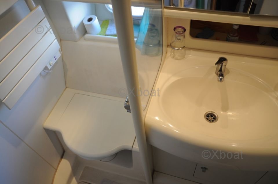 Aménagement intérieur : Le bateau dispose de trois cabines, incluant une cabine principale avec lit double, une cabine d'amis avec deux lits simples et une cabine pour l'équipage. La salle de bain est équipée d'une douche et de toilettes électriques. Le salon est spacieux et lumineux, avec une cuisine bien équipée.