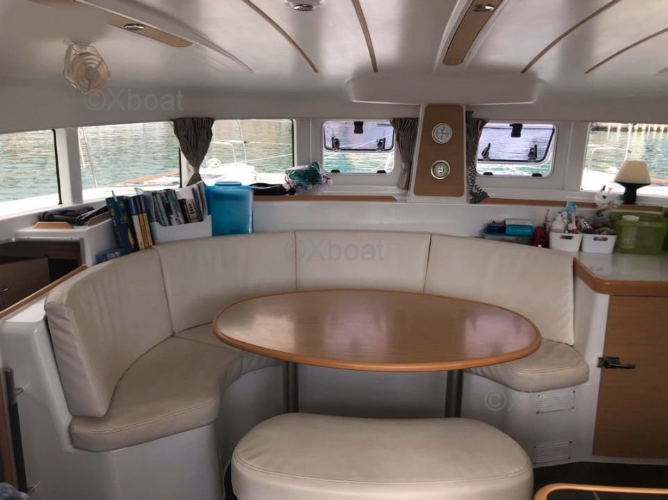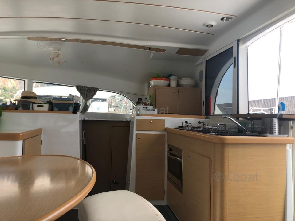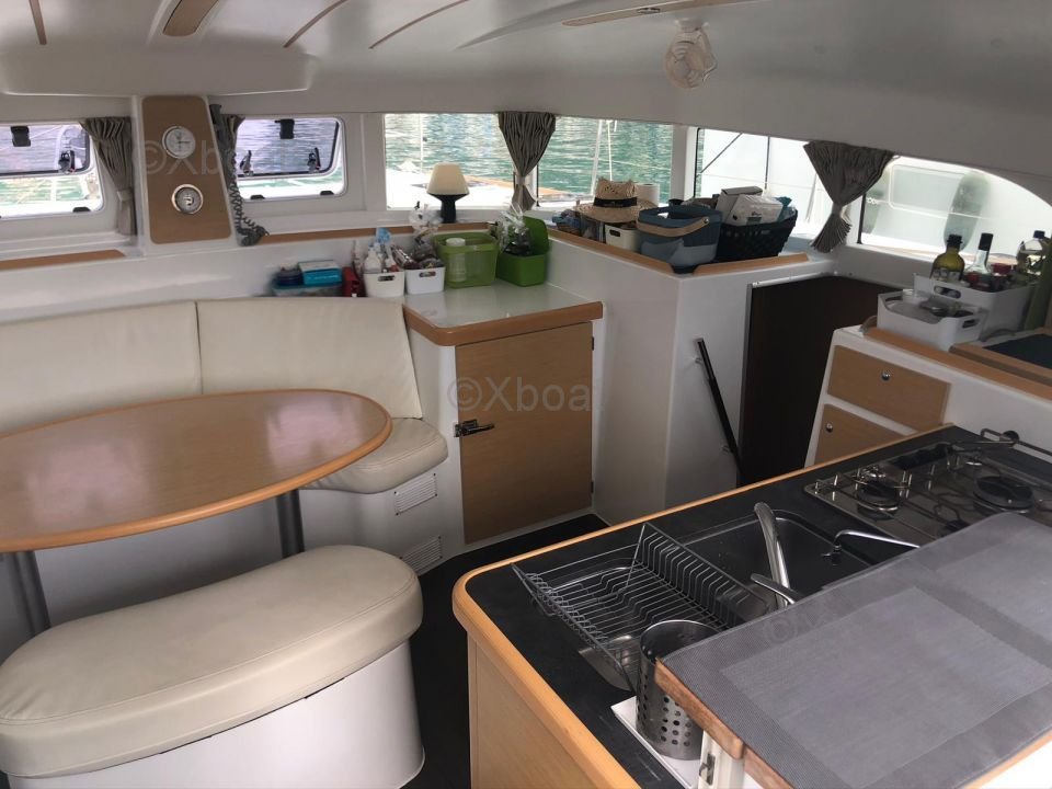 L'intérieur du Lagoon 380 est lumineux et aéré, grâce à de grandes baies vitrées et des hublots. Les cabines sont confortables et offrent un bon espace de rangement. La cuisine est bien équipée et pratique, avec un grand plan de travail et beaucoup de rangements.