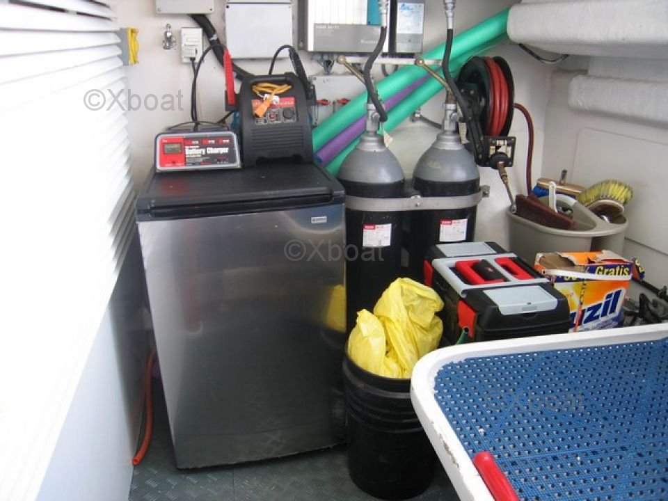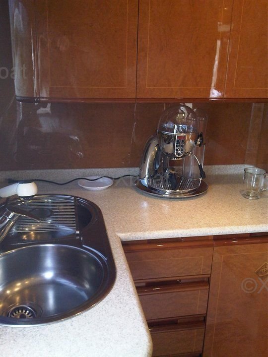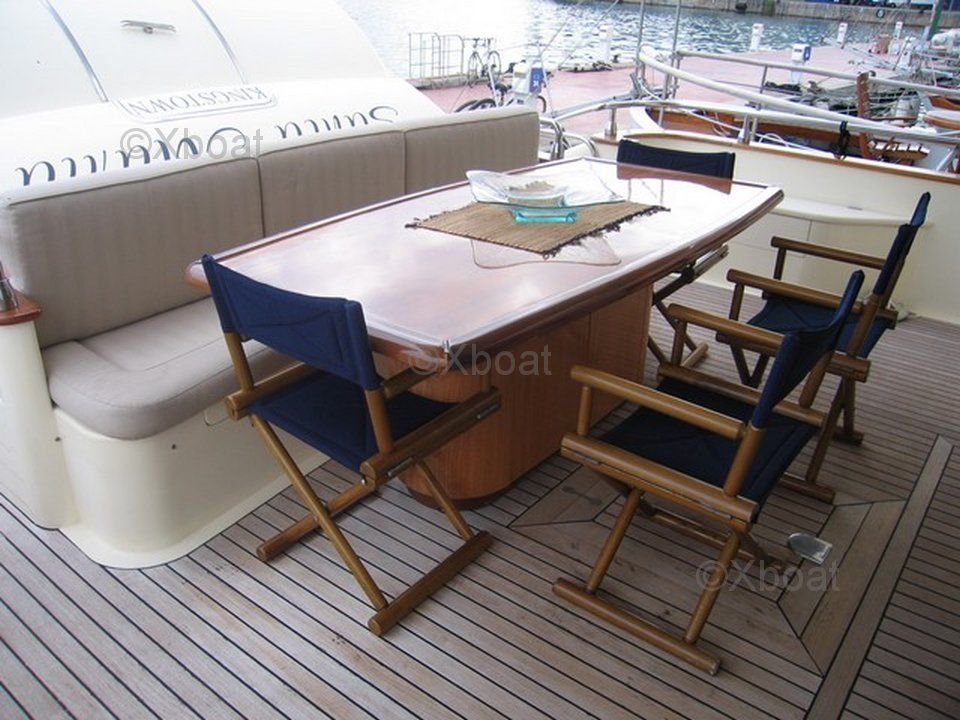 Confort et loisirs : Pour le confort des passagers, le yacht est doté de la climatisation, d'un système de divertissement avec télévision et hi-fi, ainsi que d'un système de sonorisation extérieure. À l'extérieur, une plateforme de baignade, un escalier de bain et un espace de détente avec des sièges et des tables complètent l'équipement.