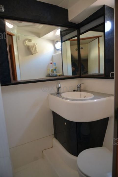 Cabine et aménagements intérieurs : Le bateau dispose de trois cabines, dont une cabine principale avec lit double, une cabine avant avec deux lits simples et une cabine arrière avec lit double. La salle de bain est équipée d'une douche séparée et d'un WC électrique. Le salon est spacieux et lumineux, avec une cuisine bien équipée.