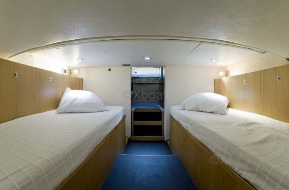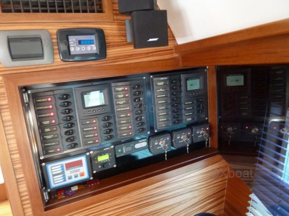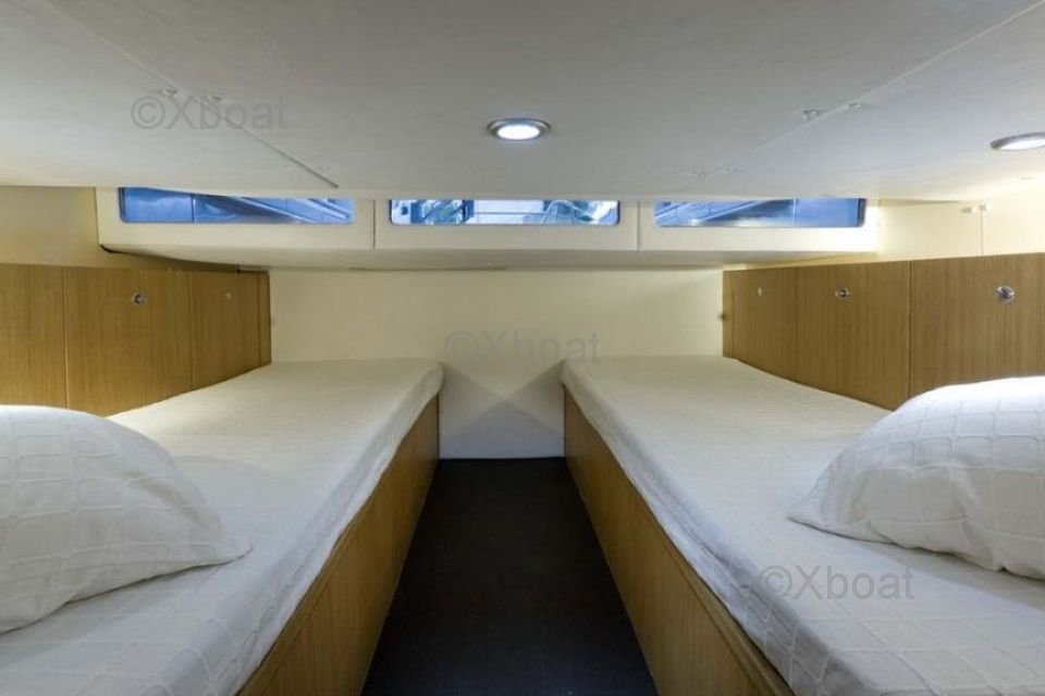 Voilure : Le bateau est équipé d'une voilure de 100 m², conçue pour maximiser la vitesse et l'efficacité. La grand-voile et le génois sont en tissu performant, offrant une bonne résistance aux intempéries et une excellente tenue en navigation.