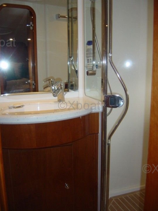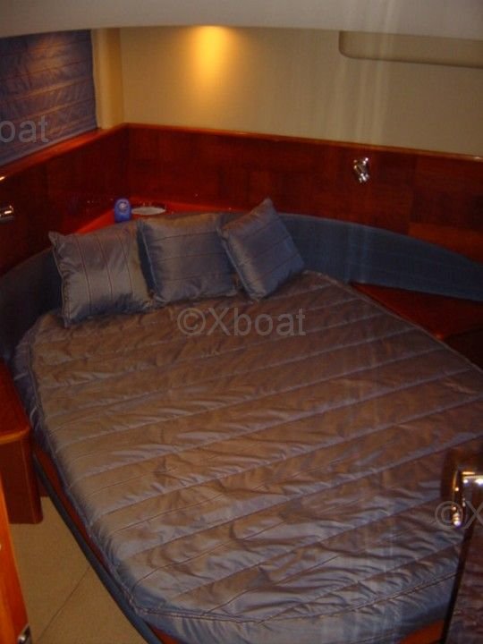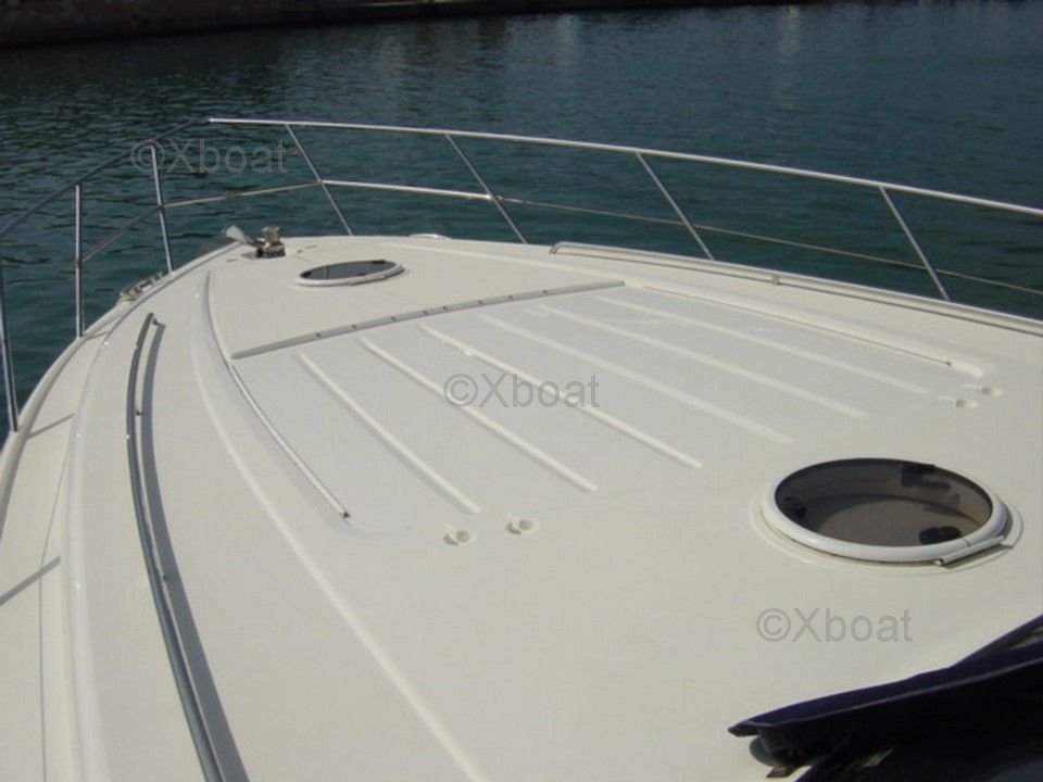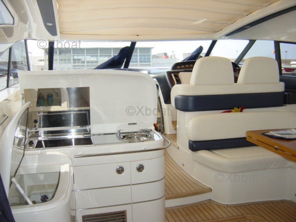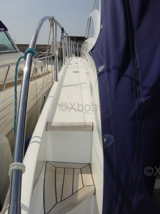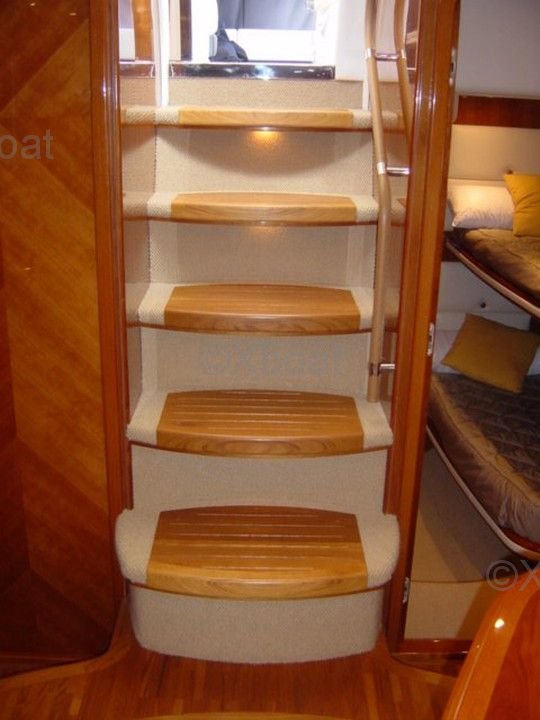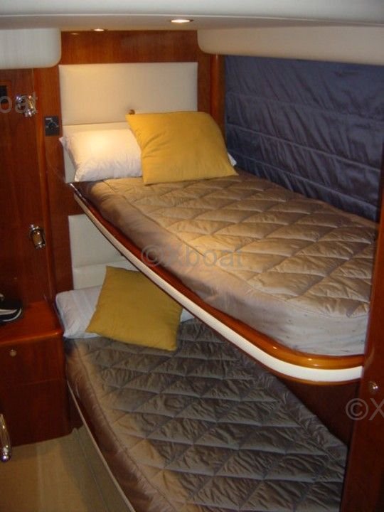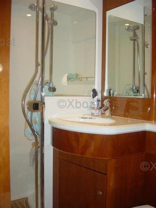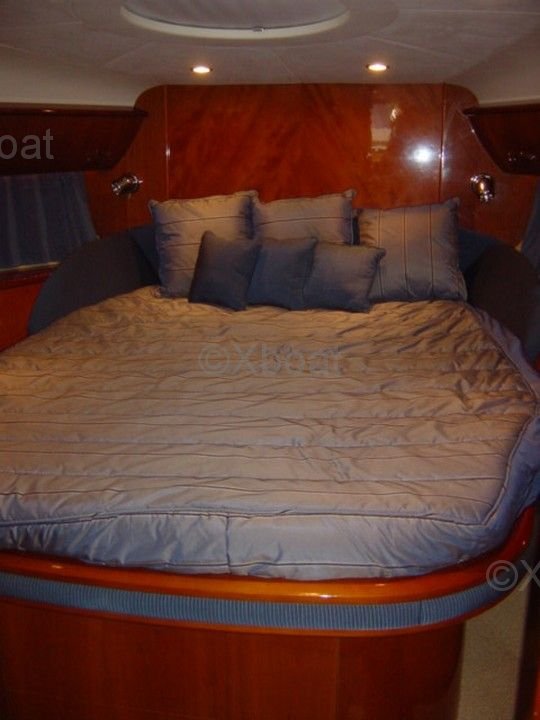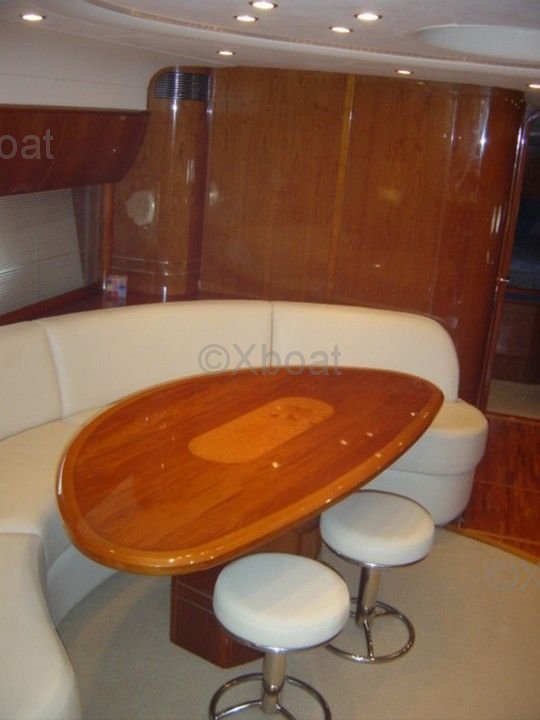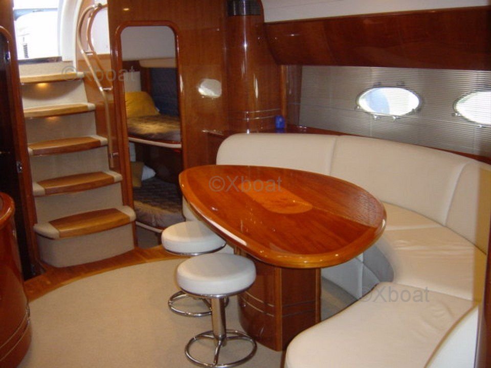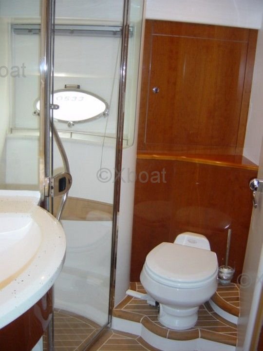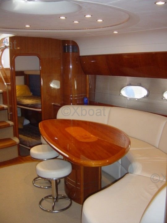 Aménagement intérieur : L'intérieur du Princess V58 est spacieux et luxueux, avec des finitions de haute qualité. Il dispose de trois cabines, dont une suite principale à l'avant, une cabine double et une cabine avec lits superposés. La salle de bain principale est équipée d'une douche séparée, et il y a une salle de bain supplémentaire pour les invités.