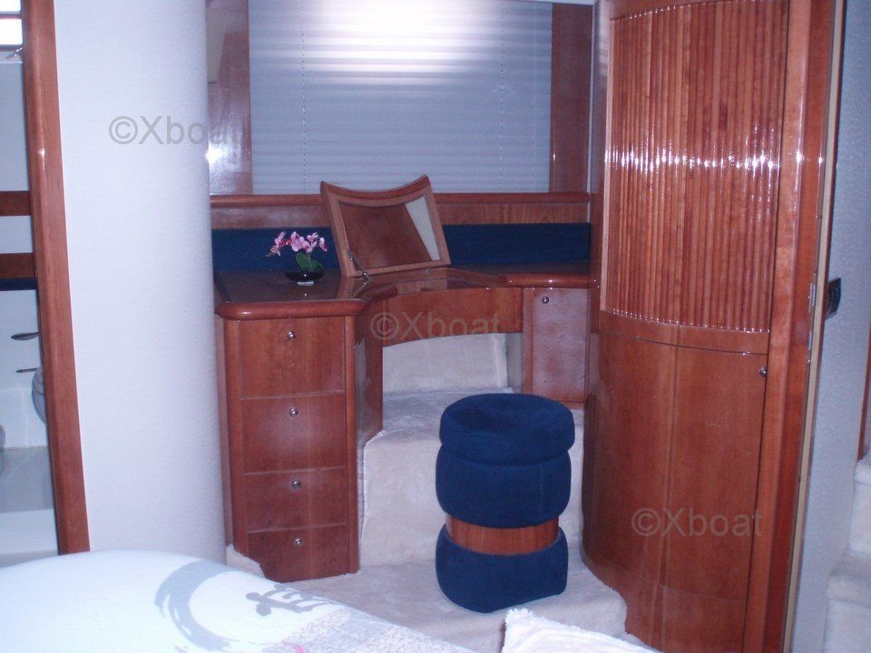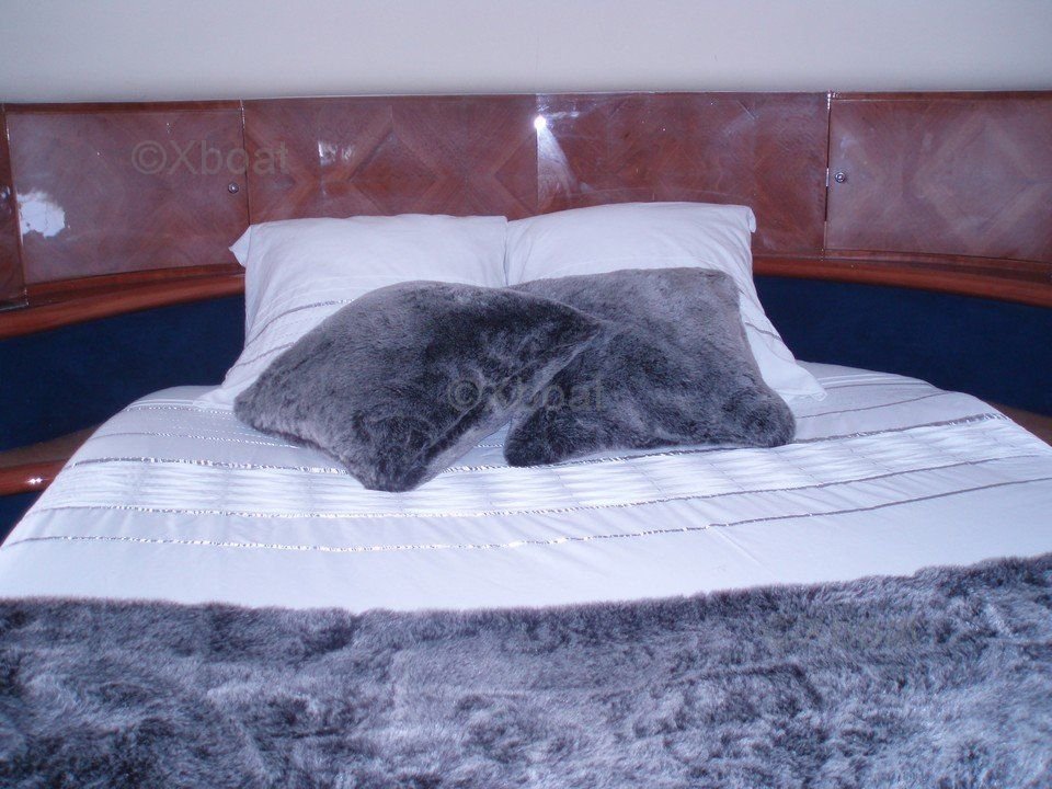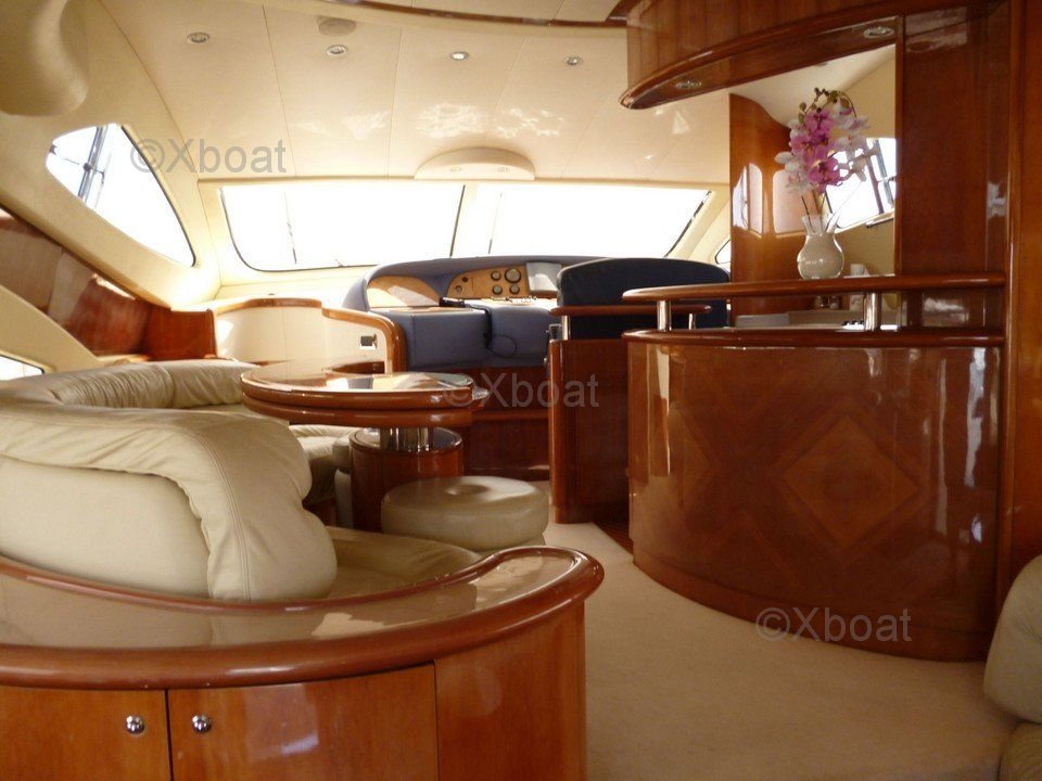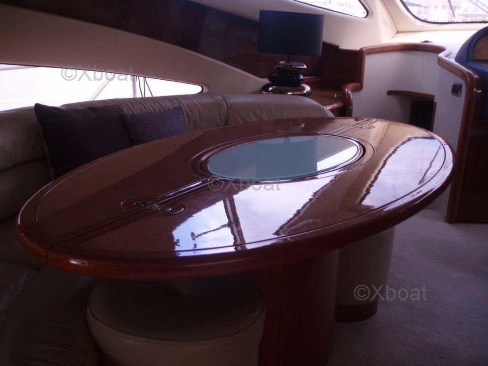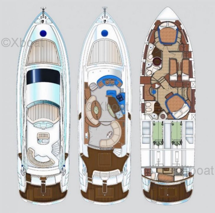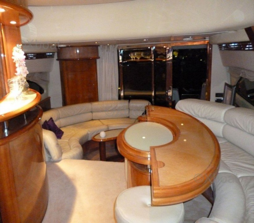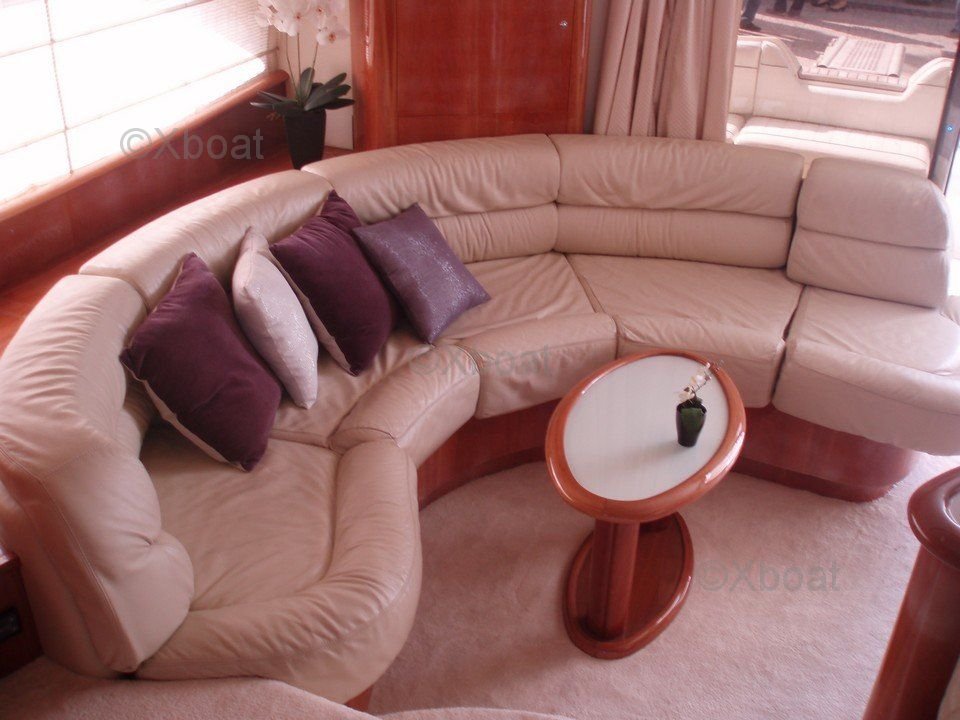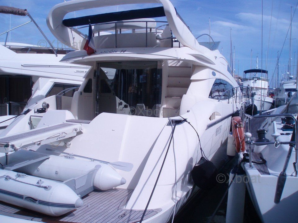 Équipements de pont : Le AICON 56 est équipé d'un Flybridge avec des sièges confortables et une table à manger, idéal pour les repas en plein air. Le pont arrière dispose d'une plateforme de bain et d'un escalier menant à la plage arrière.