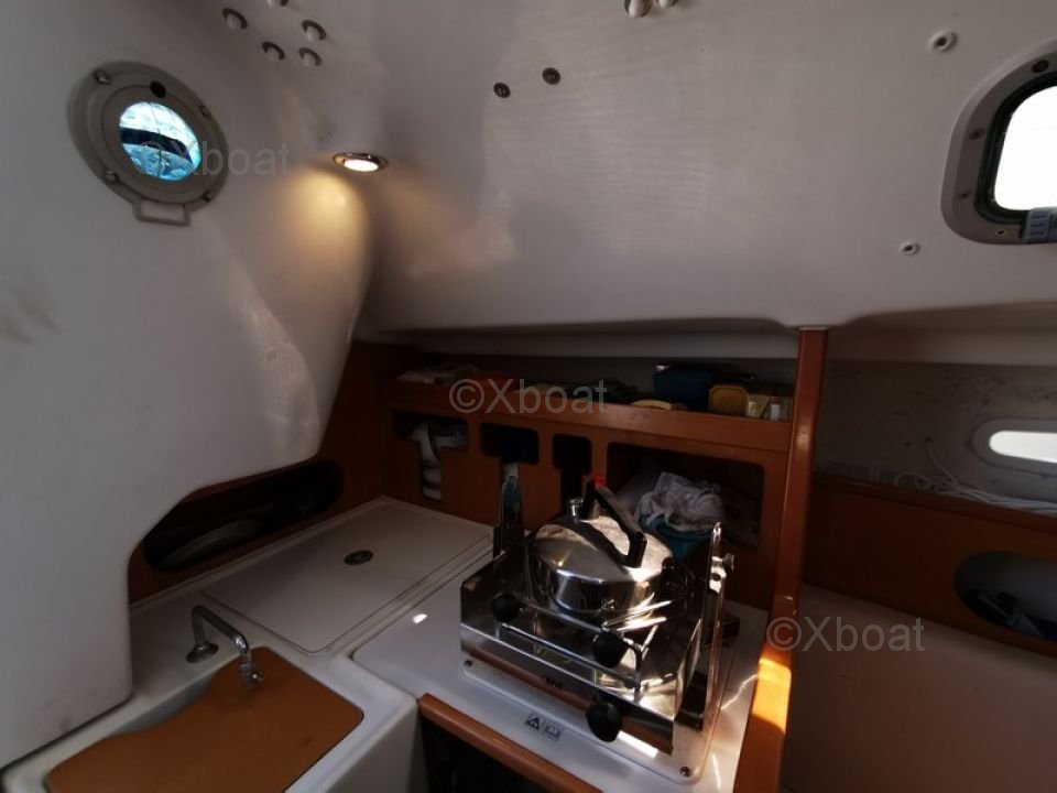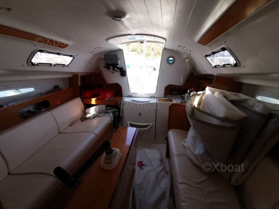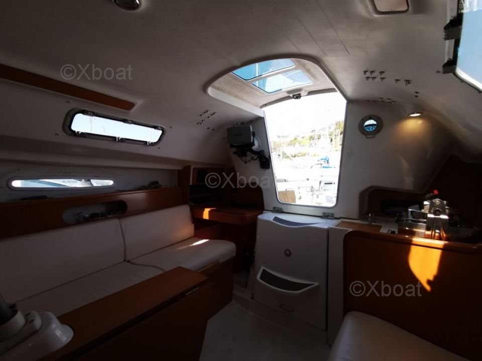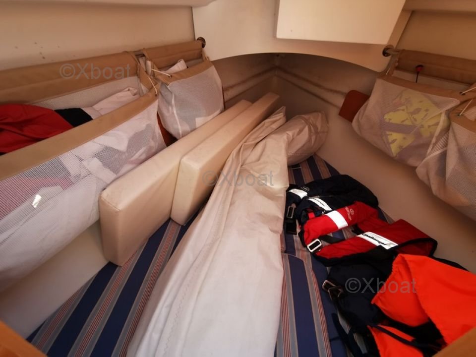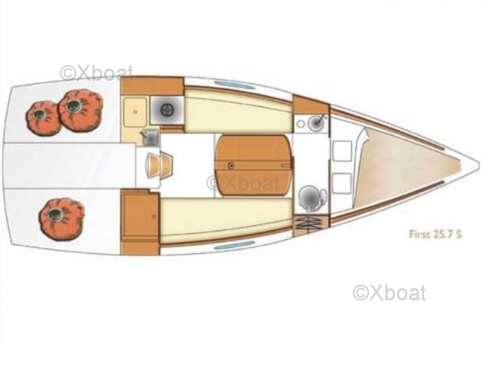 L'intérieur du First 25.7 est conçu pour offrir un bon confort malgré ses dimensions compactes. Il dispose de deux couchettes dans le cockpit, une cuisine équipée et un espace de rangement optimisé.