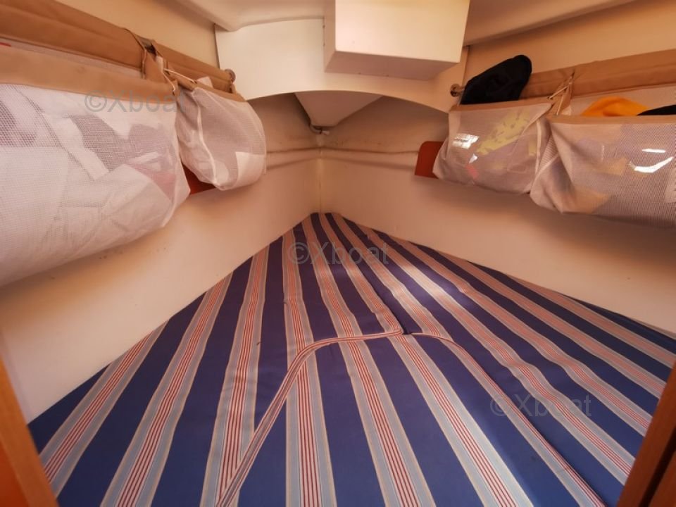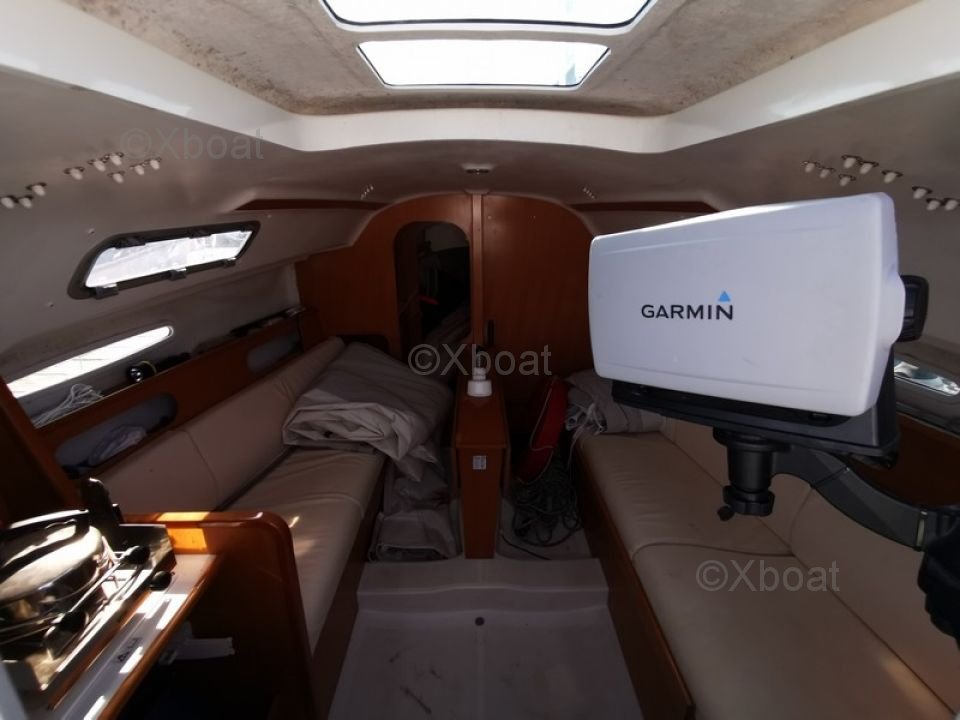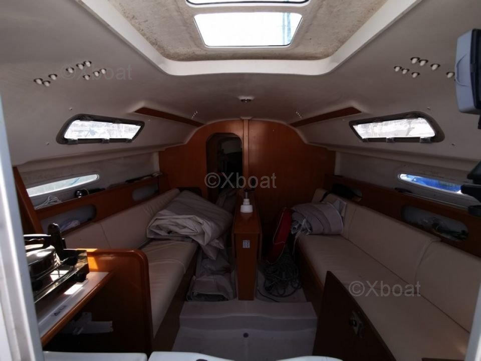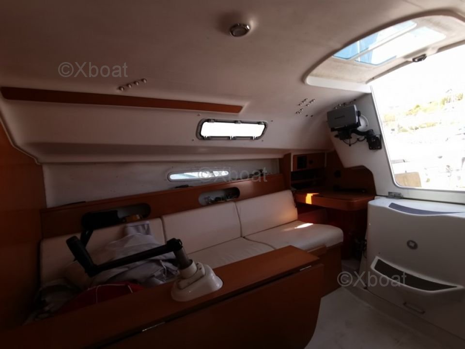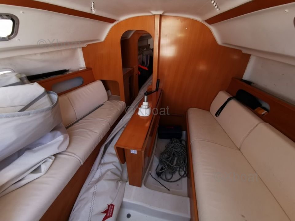 L'intérieur du First 25.7 est conçu pour offrir un bon confort malgré ses dimensions compactes. Il dispose de deux couchettes dans le cockpit, une cuisine équipée et un espace de rangement optimisé.