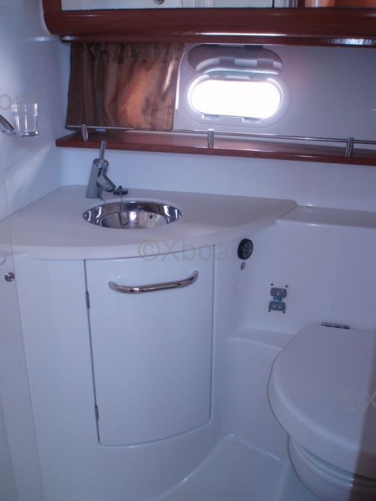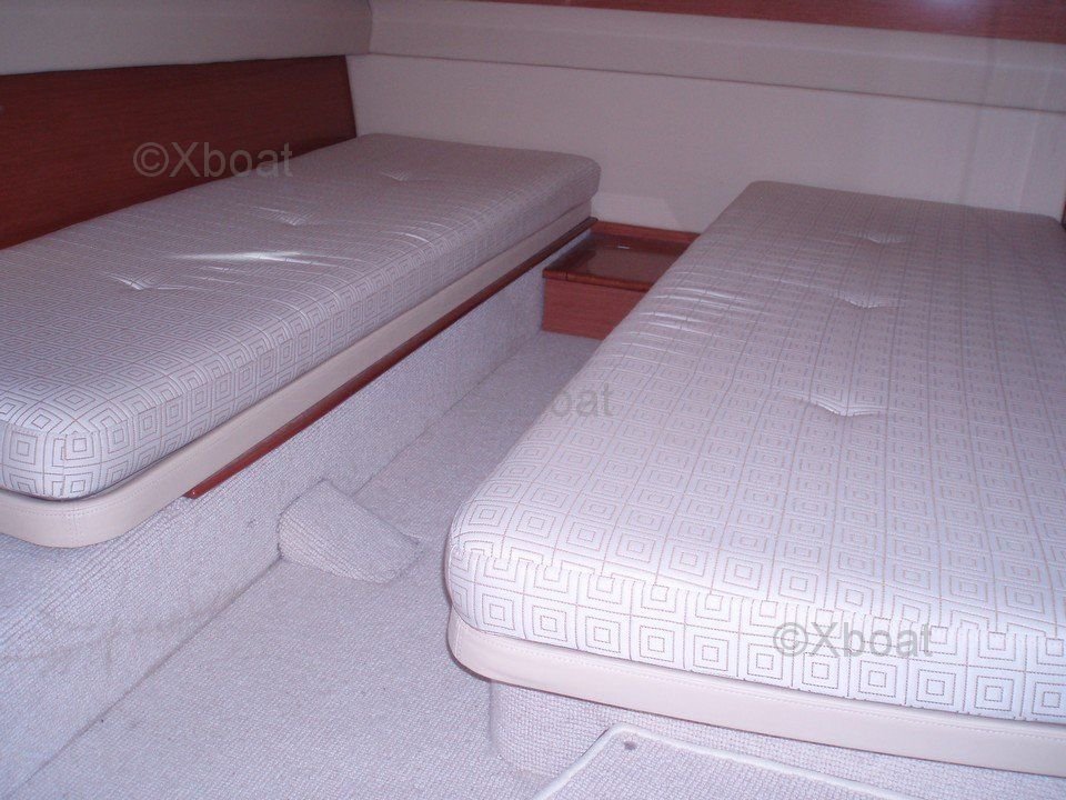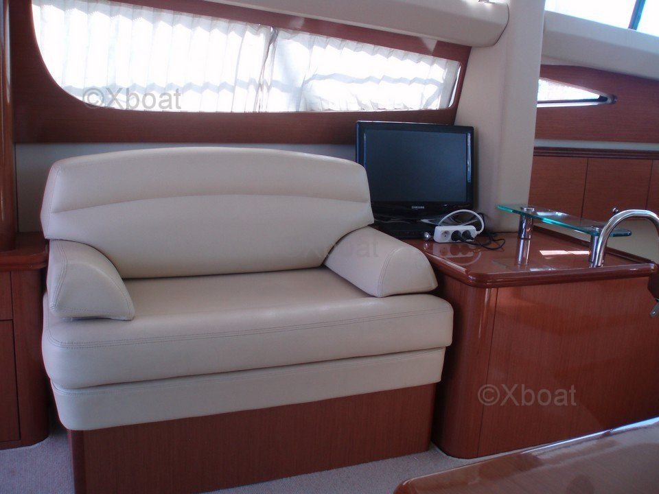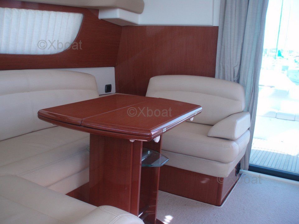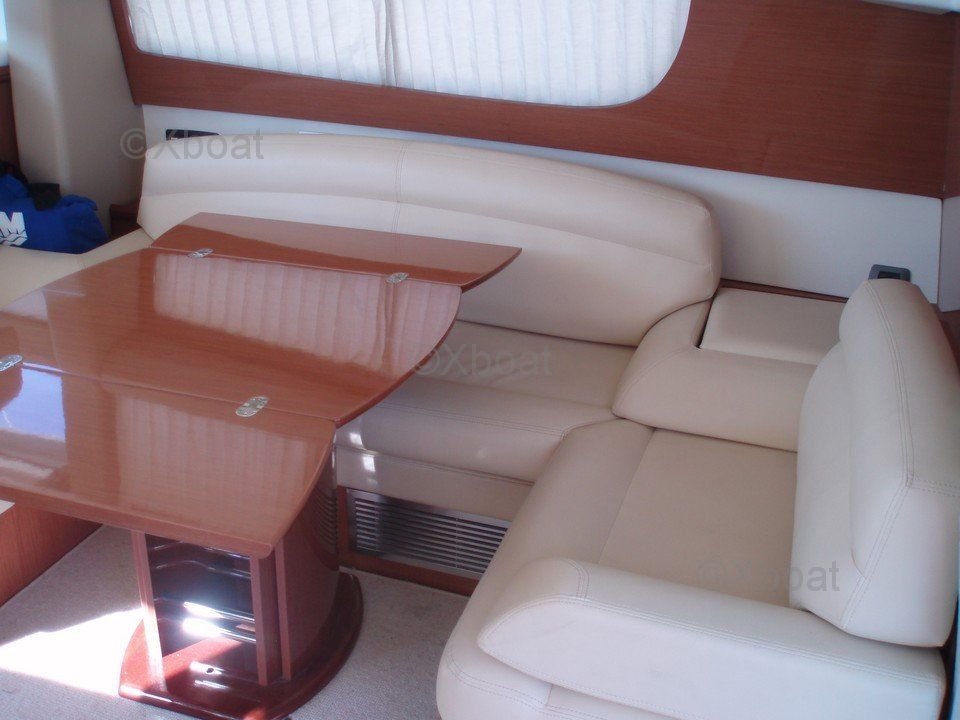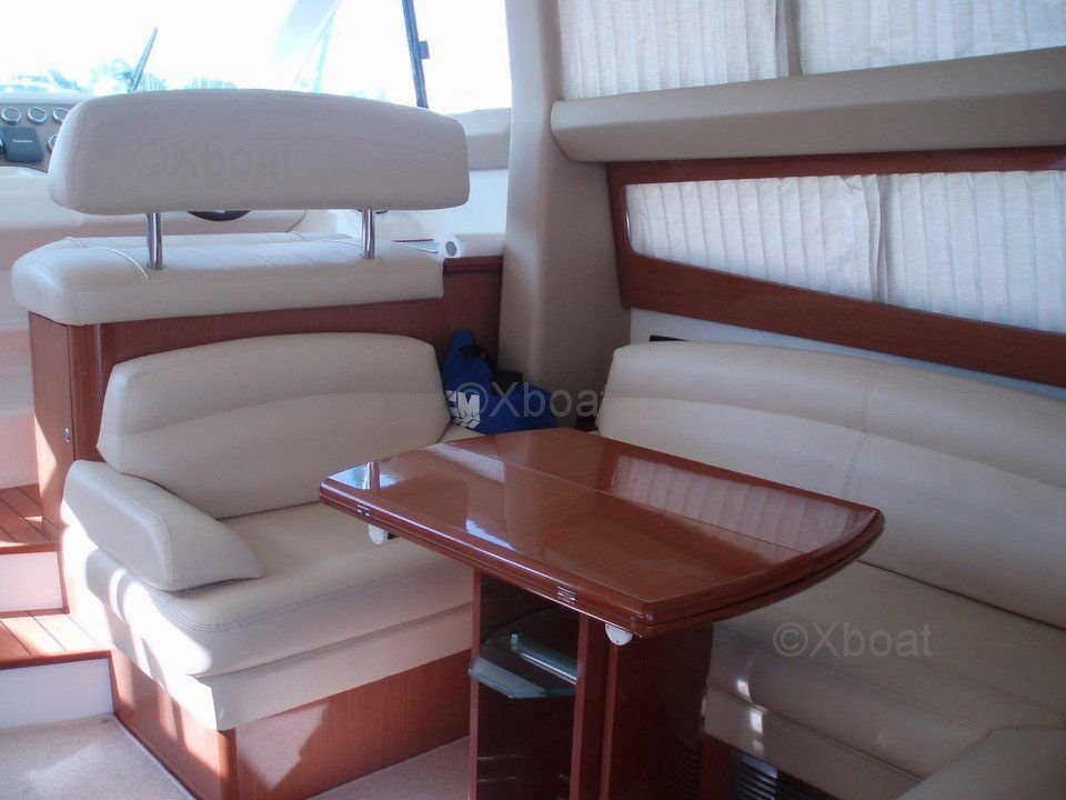 Aménagement intérieur : L'intérieur du Prestige 42 est spacieux et lumineux, avec des finitions en bois de haute qualité. Le salon est équipé de sièges confortables et d'une table à manger, offrant un espace de vie convivial. La cuisine est bien équipée avec des appareils électroménagers modernes. Les cabines sont spacieuses, avec des lits doubles et des rangements abondants. La cabine principale dispose d'une salle de bain privée avec douche.