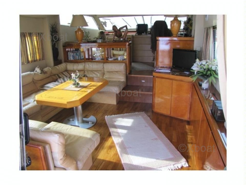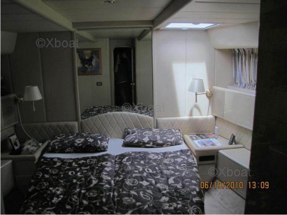 Confort et Équipements : Le Mangusta 65 Fly est conçu pour offrir un confort optimal à ses passagers. Il dispose de 3 cabines, pouvant accueillir jusqu'à 6 personnes en toute intimité. La cabine principale est équipée d'une salle de bain privée, tandis que les cabines d'invités partagent une salle de bain commune. Le pont supérieur, accessible par un escalier, offre une zone de détente spacieuse avec un salon extérieur et un espace pour les repas.