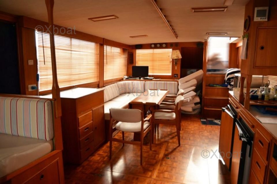 Aménagement Intérieur : L'intérieur du Grand Banks 49 est spacieux et luxueux, avec des cabines confortables et des espaces de vie bien conçus. Il dispose de trois cabines, dont une suite principale avec salle de bain privée, ainsi que de deux cabines d'amis. Le salon est équipé de grandes fenêtres offrant une vue imprenable sur l'extérieur.