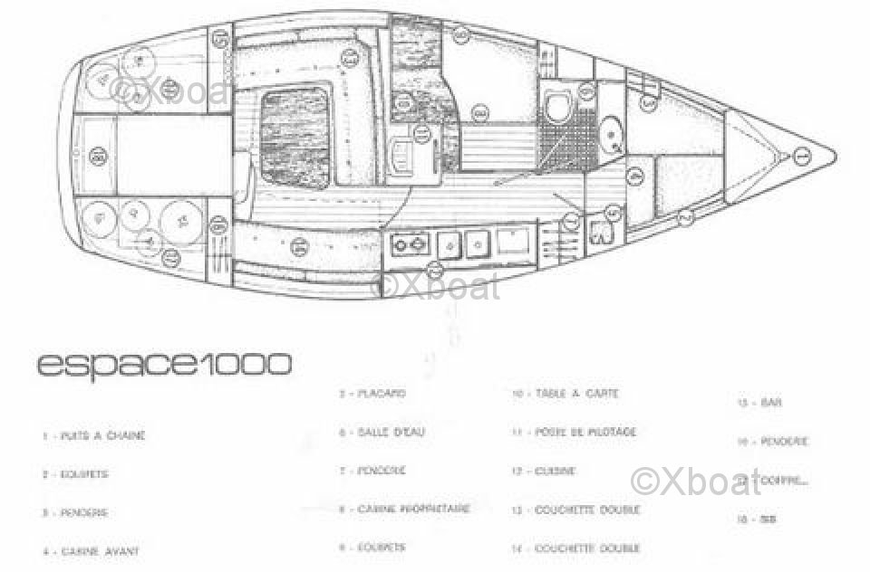 L'Espace 1000 est équipé d'un cockpit spacieux et d'un intérieur bien agencé, offrant jusqu'à 6 couchages. La cuisine est fonctionnelle et bien équipée, tandis que la salle de bain est confortable. Le bateau est également doté de nombreux rangements, ce qui en fait un excellent choix pour les longues croisières.