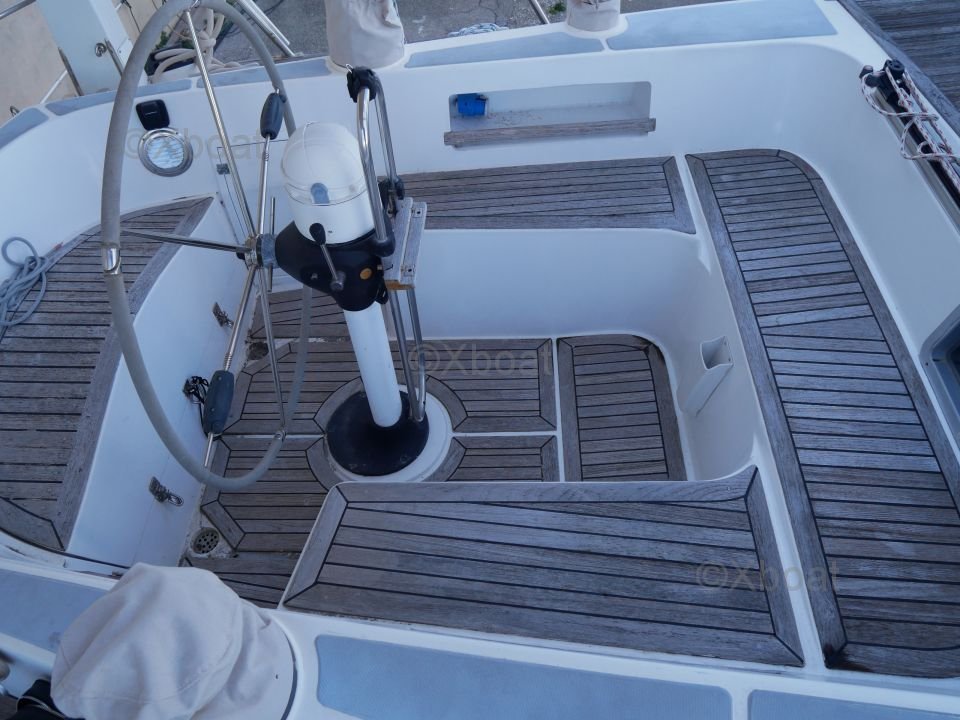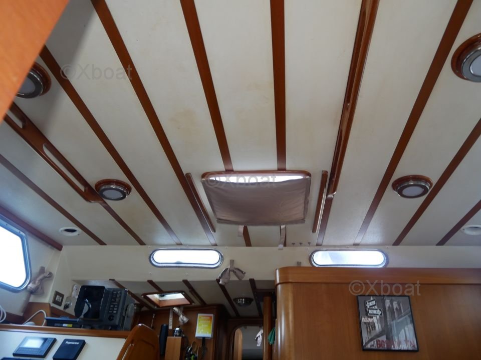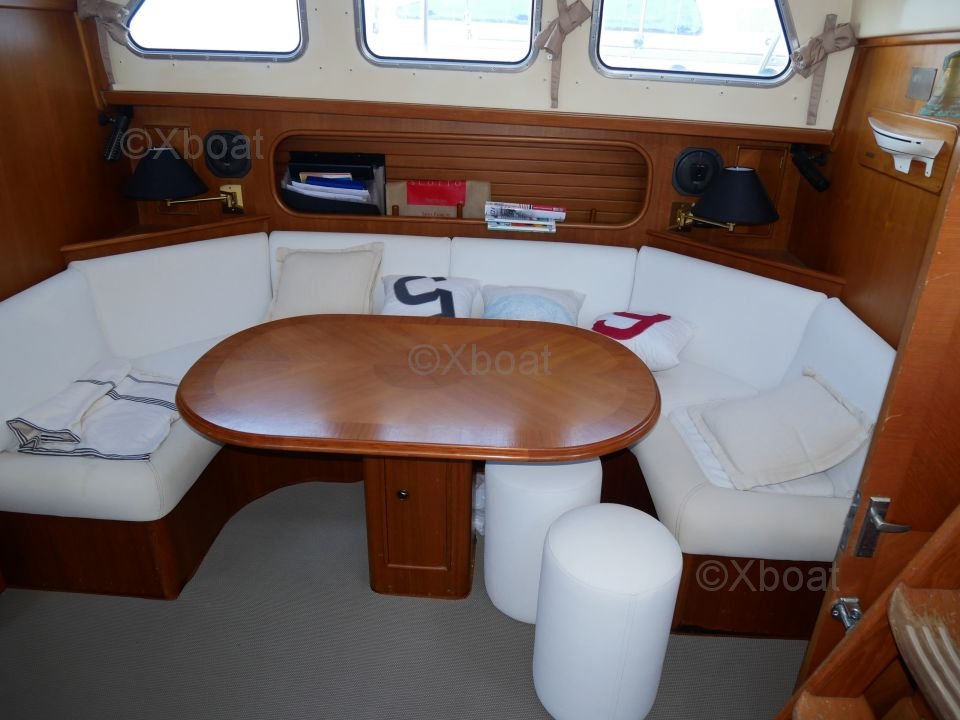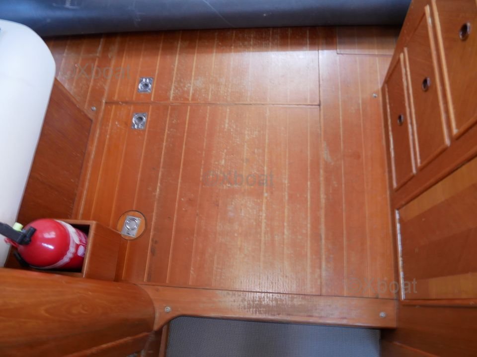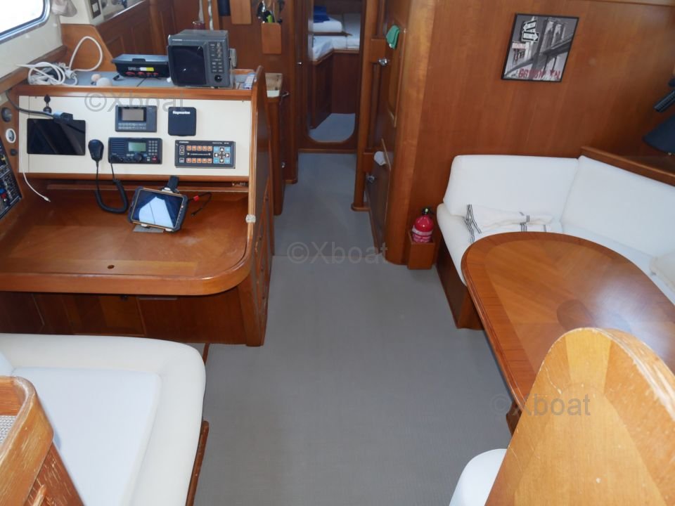 L'intérieur du bateau est aménagé avec soin, utilisant des bois teintés pour un aspect chaleureux et élégant. Les espaces de vie sont conçus pour offrir un maximum de confort, que ce soit pour des sorties en famille ou pour des régates.
