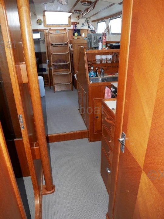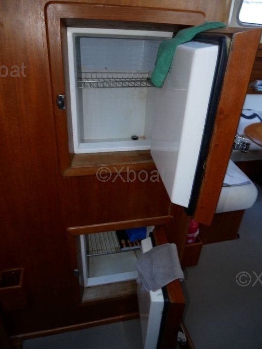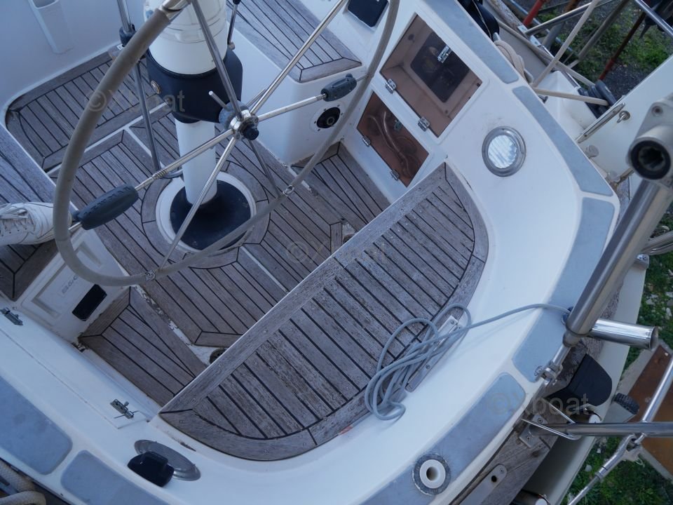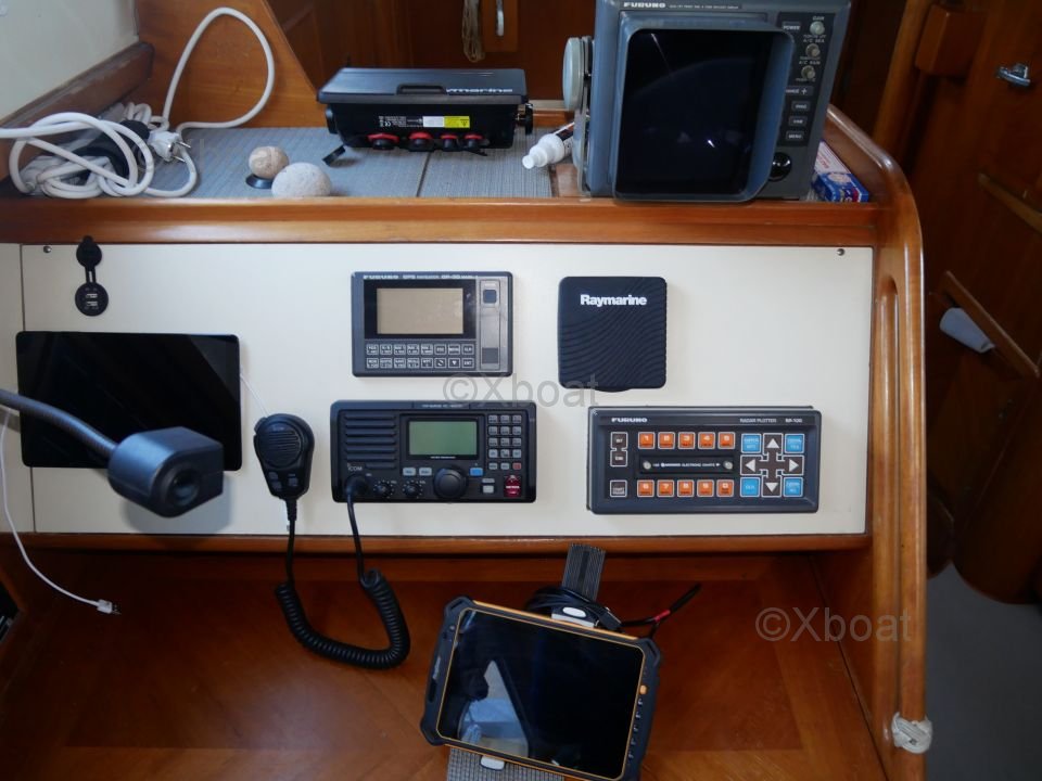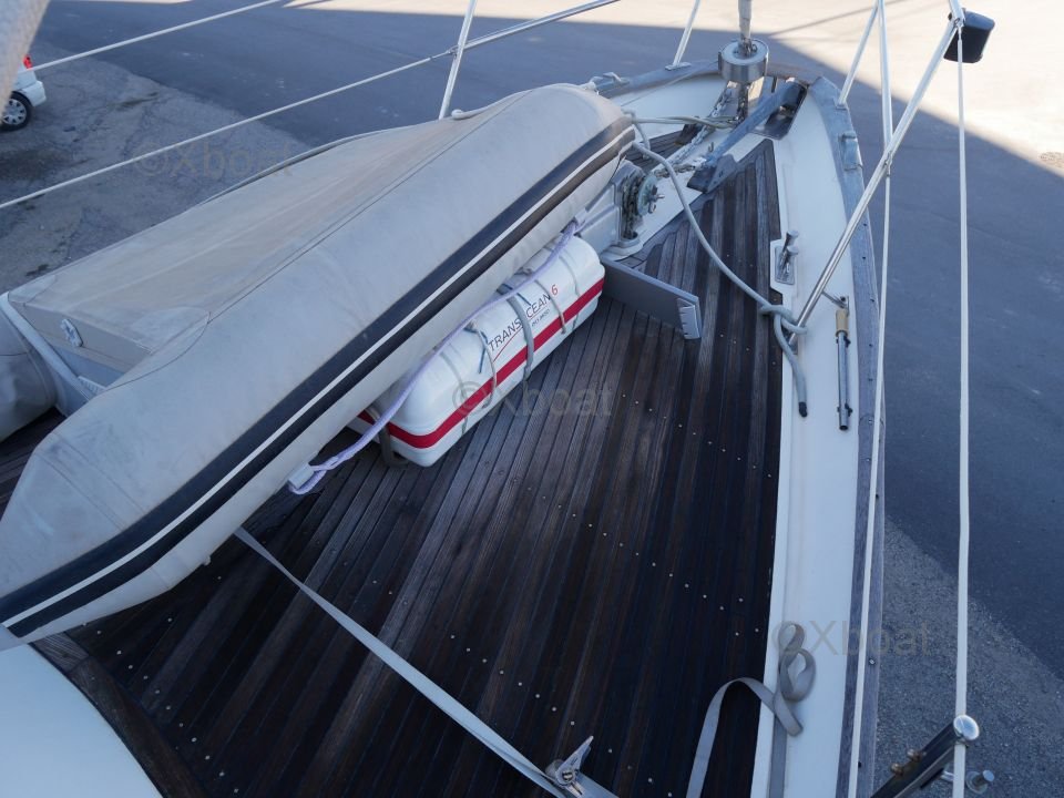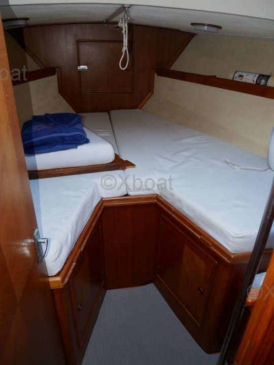 L'intérieur du bateau est aménagé avec soin, utilisant des bois teintés pour un aspect chaleureux et élégant. Les espaces de vie sont conçus pour offrir un maximum de confort, que ce soit pour des sorties en famille ou pour des régates.
