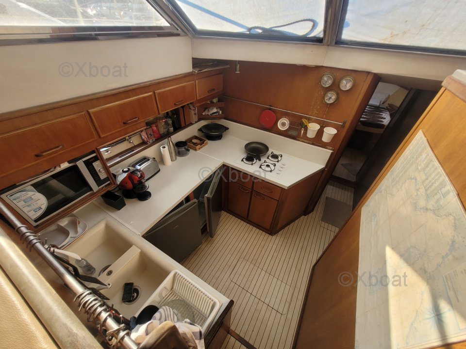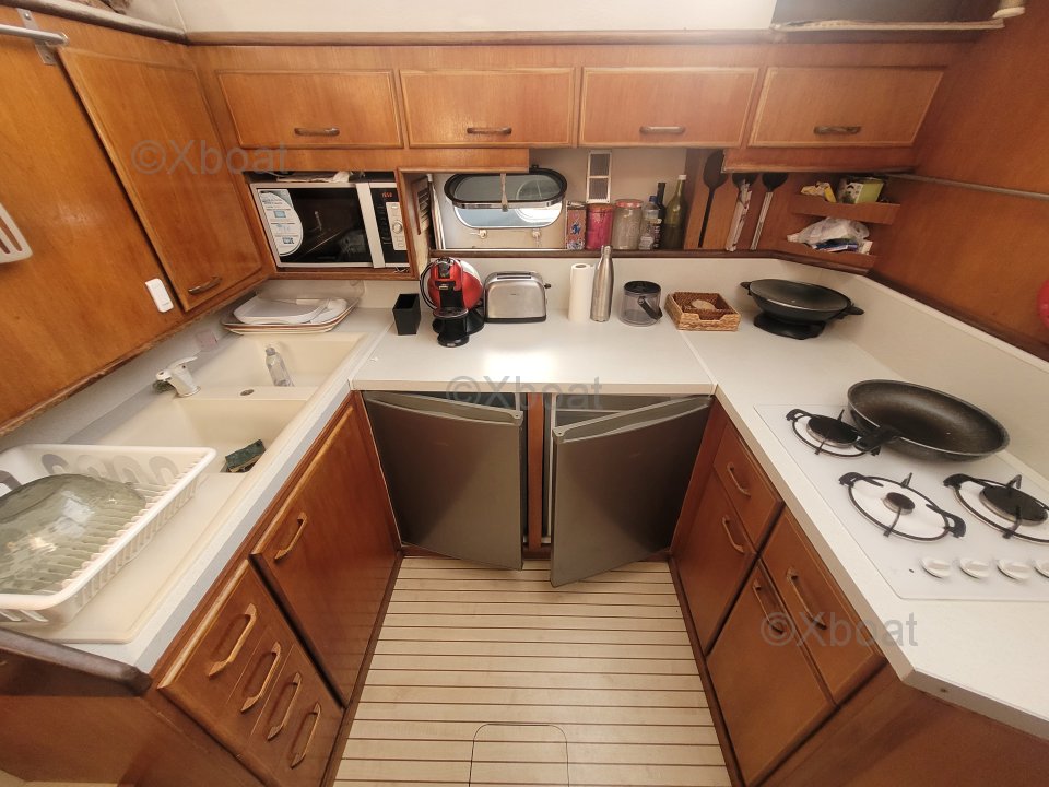 L'intérieur du bateau est conçu pour le confort et l'habitabilité. Les cabines sont spacieuses et bien aménagées, offrant un espace de vie agréable. La cuisine est particulièrement impressionnante, avec des dimensions qui la rendent fonctionnelle et pratique pour les longs voyages.