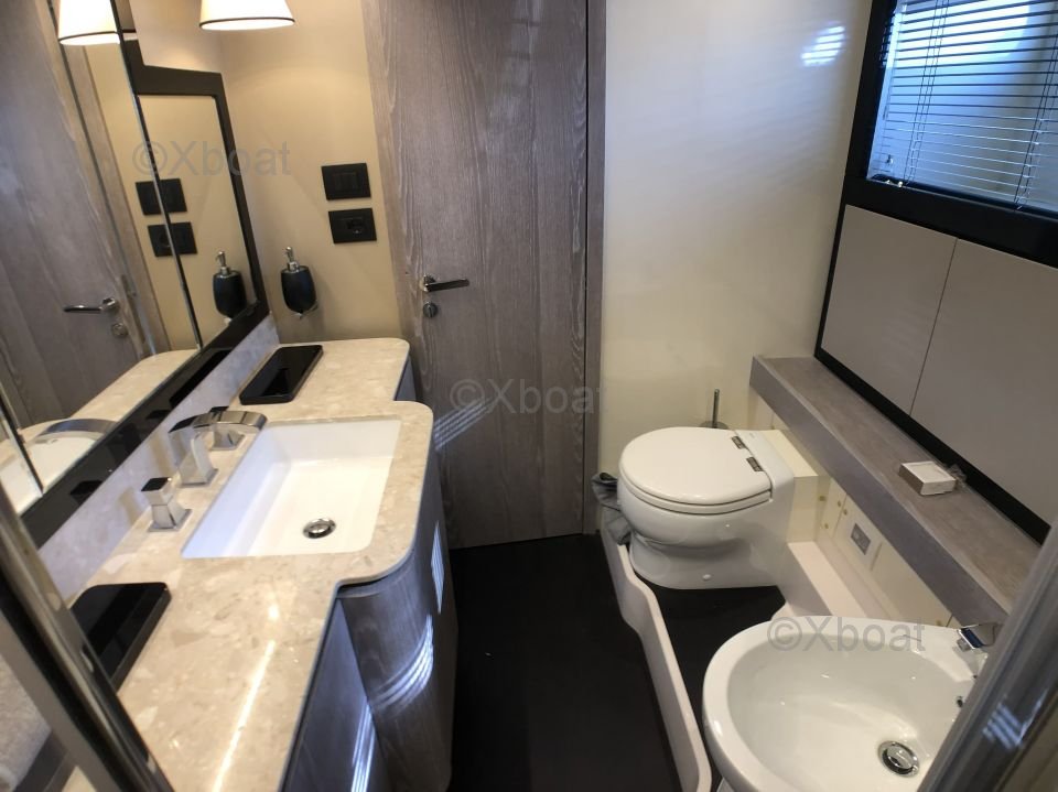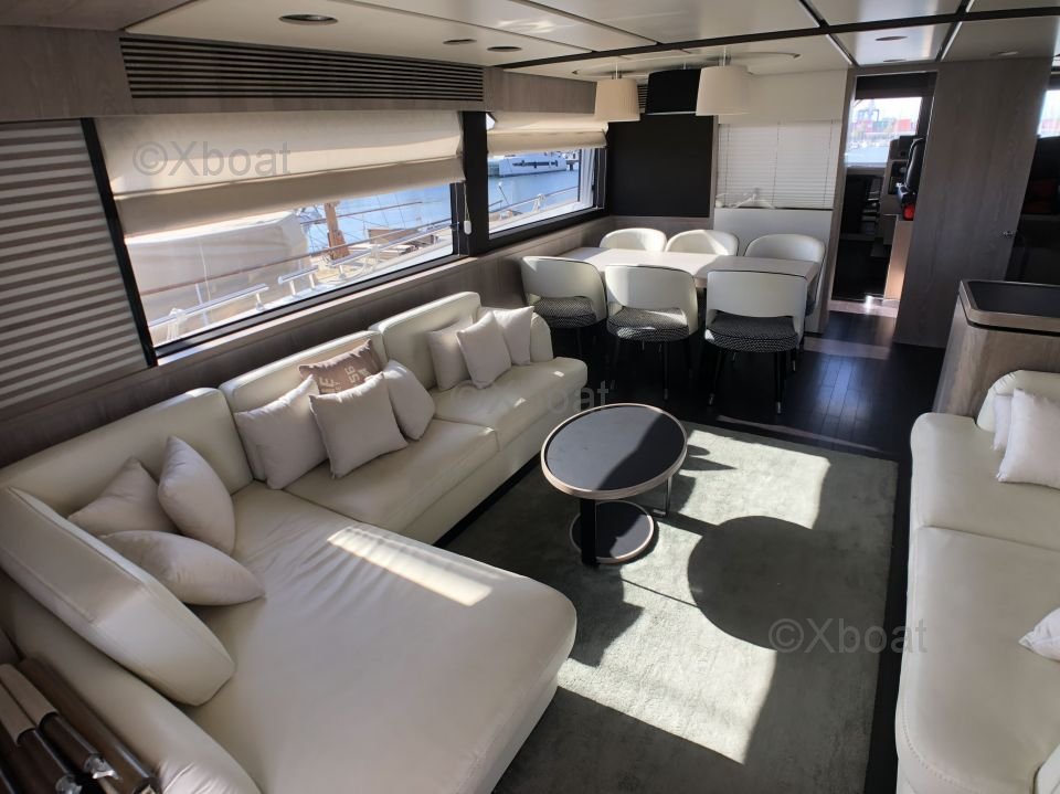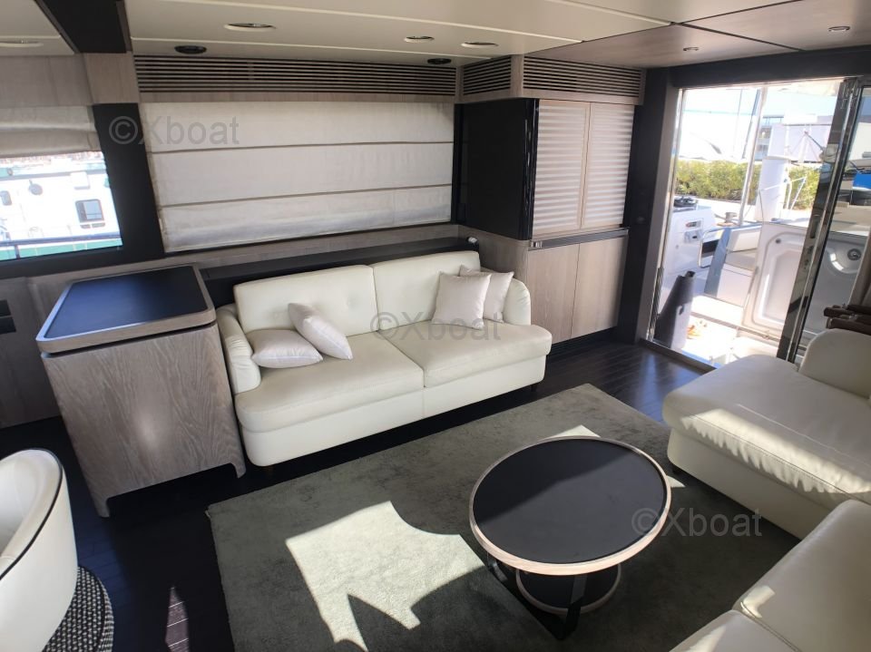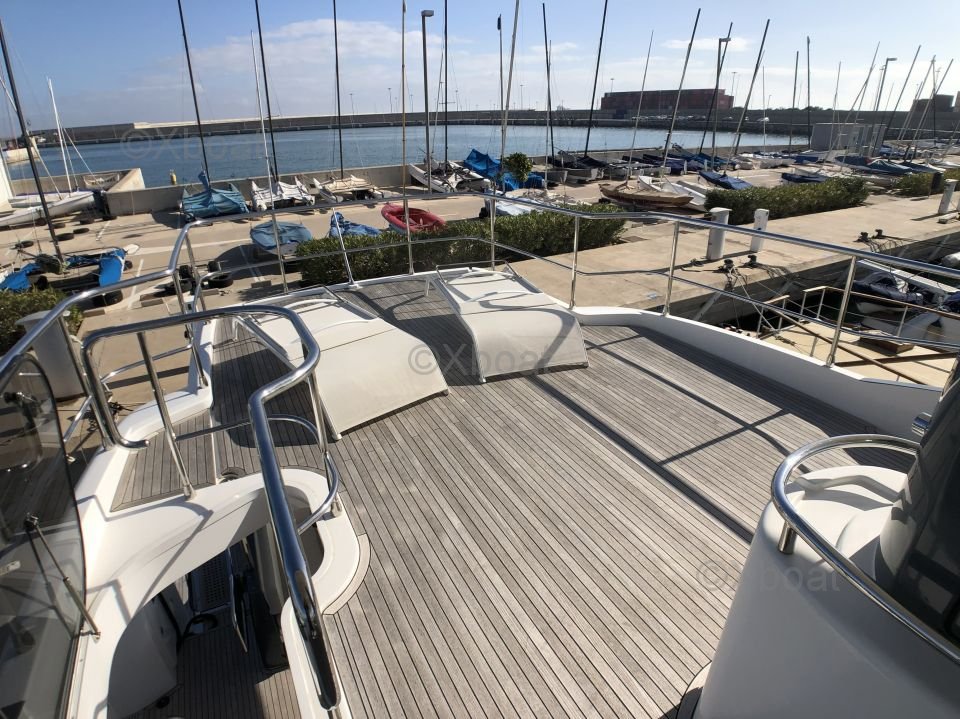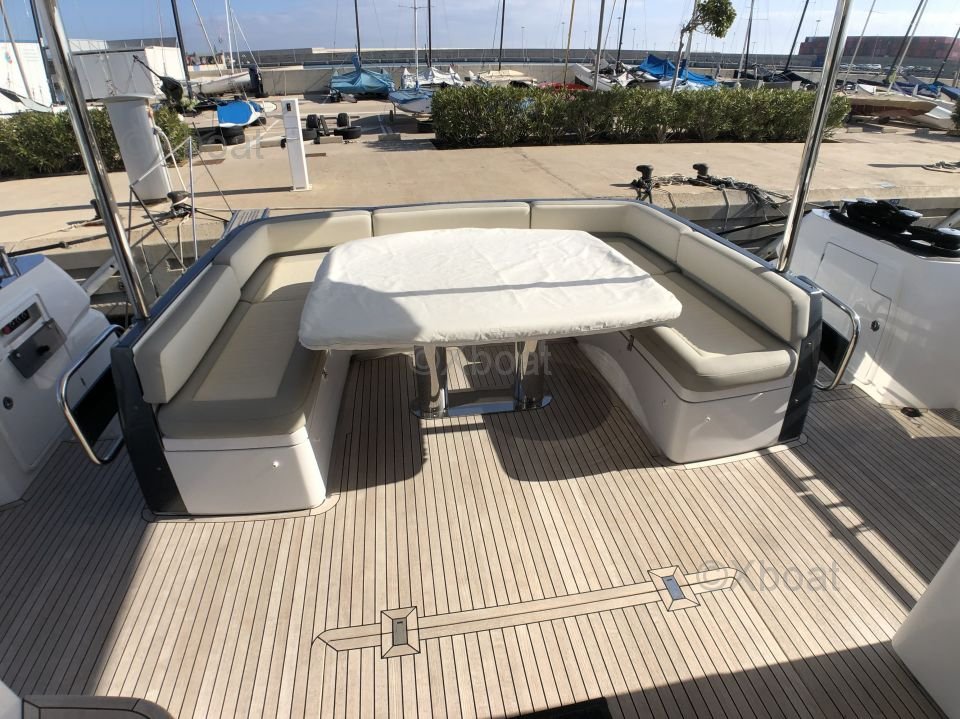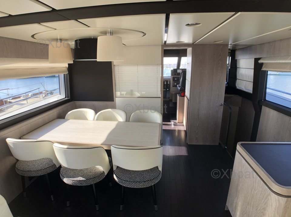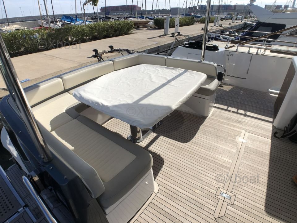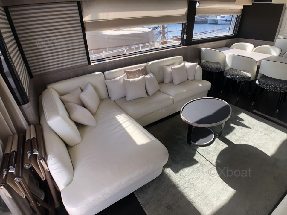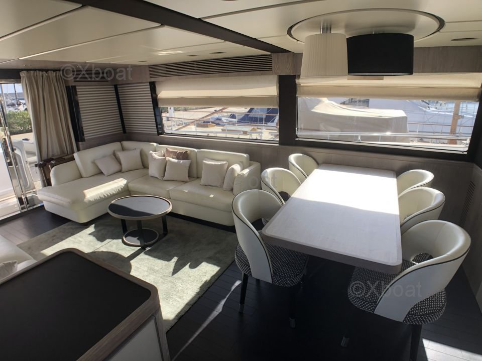 Espaces extérieurs : Le pont principal est spacieux et offre un salon extérieur avec une table à manger, un espace de détente et un bar. Le flybridge est équipé d'un second poste de pilotage, d'un solarium et d'un espace de détente supplémentaire.