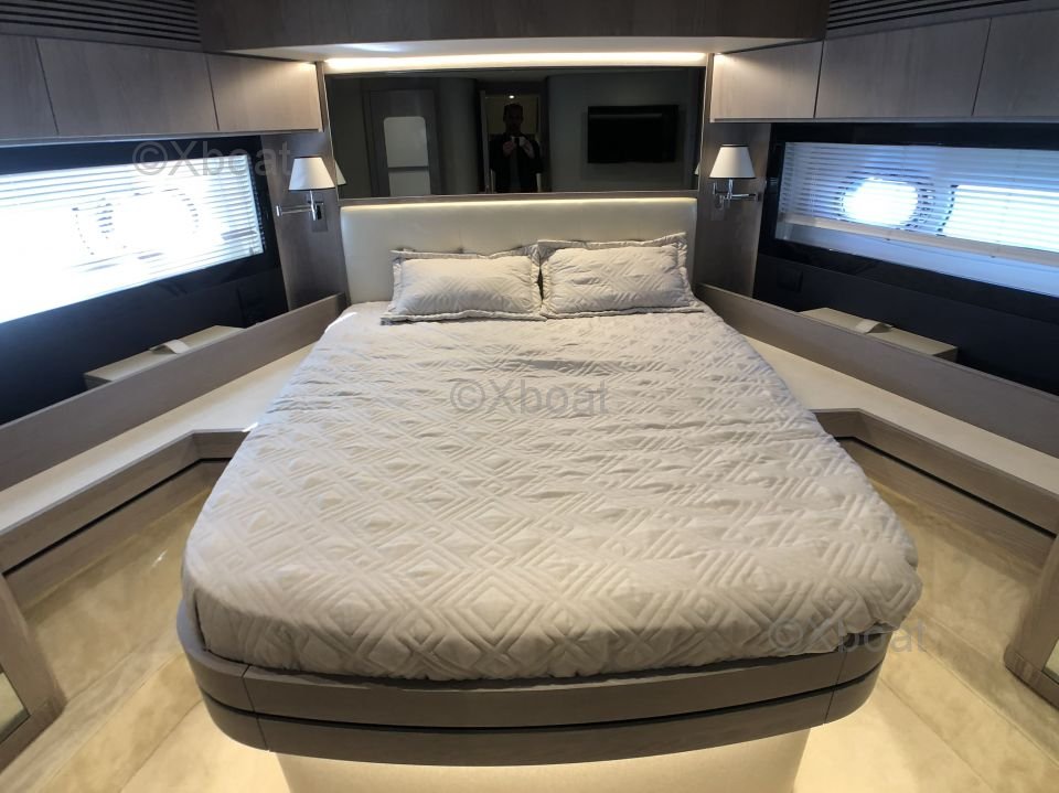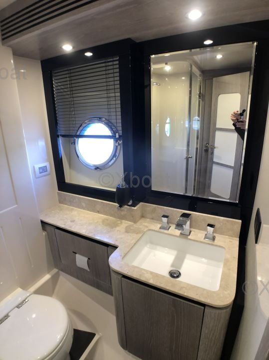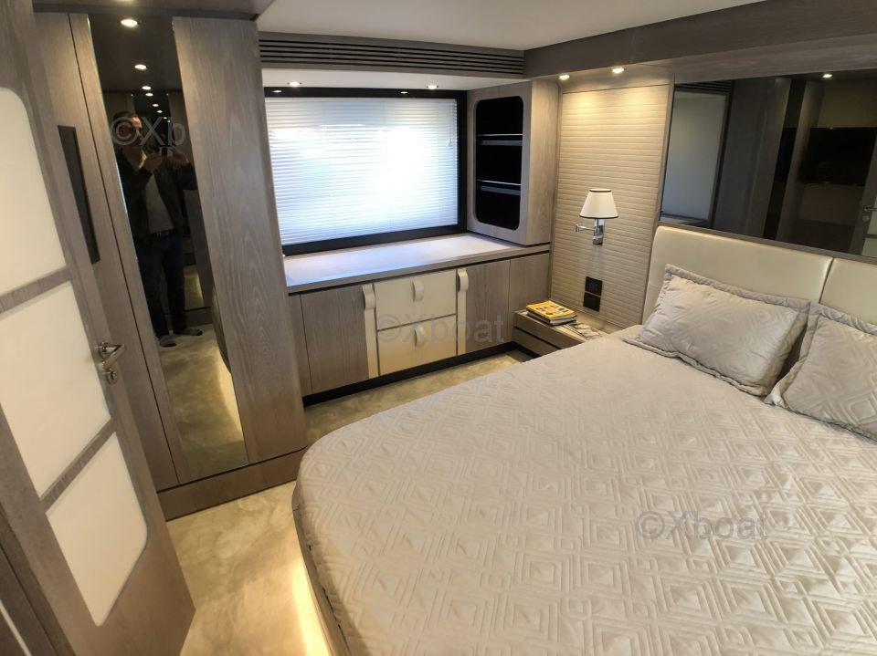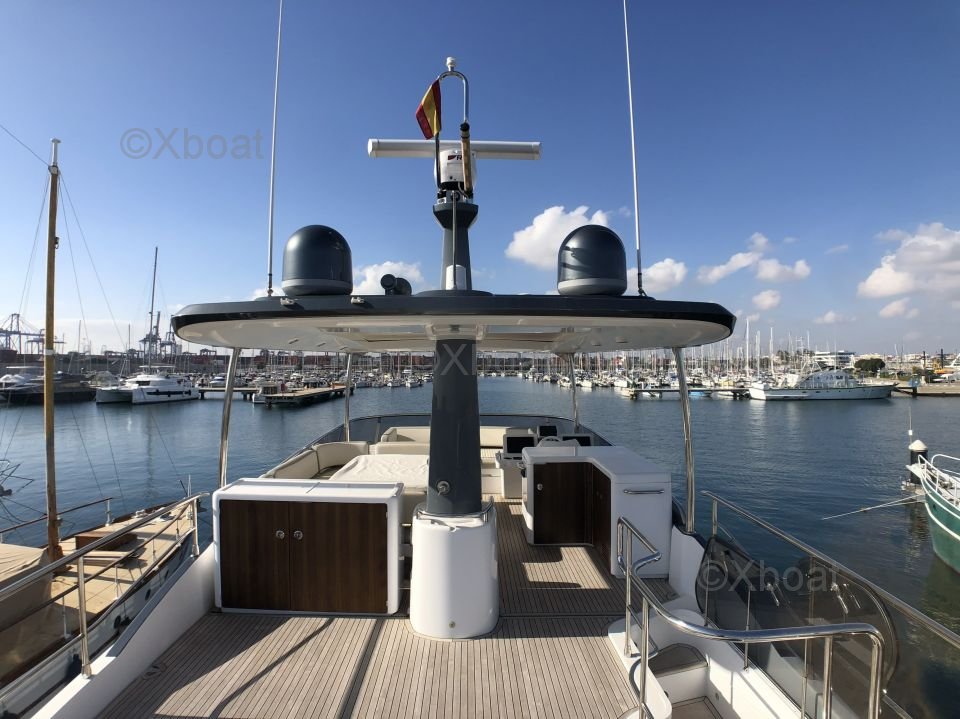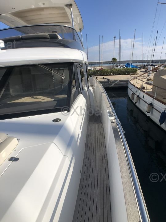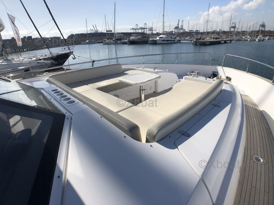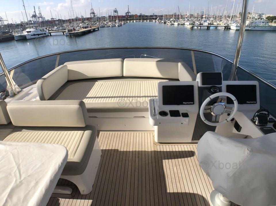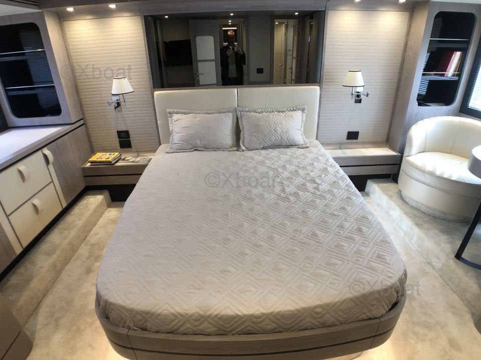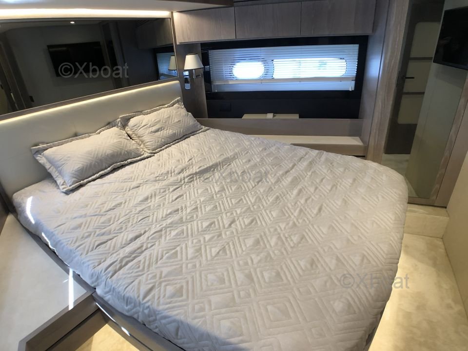 Espaces extérieurs : Le pont principal est spacieux et offre un salon extérieur avec une table à manger, un espace de détente et un bar. Le flybridge est équipé d'un second poste de pilotage, d'un solarium et d'un espace de détente supplémentaire.