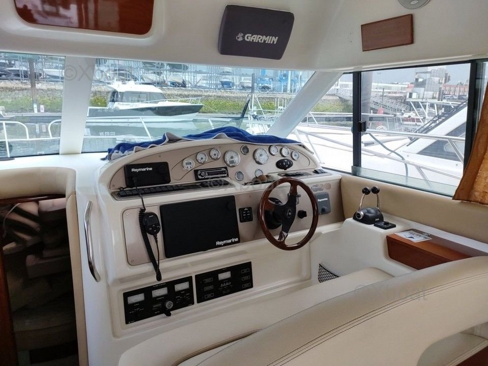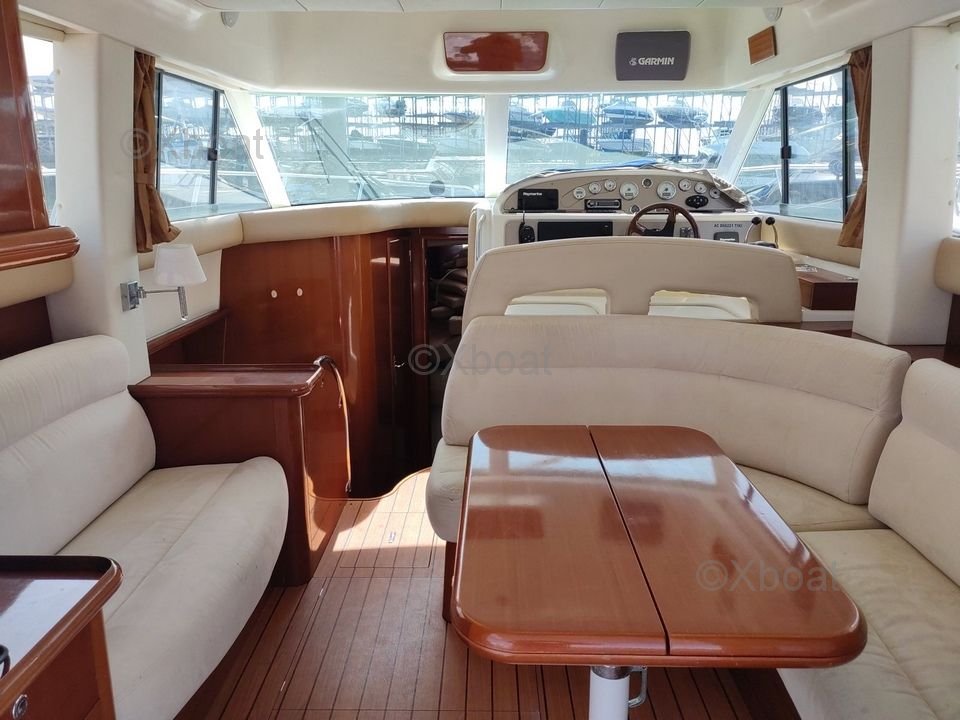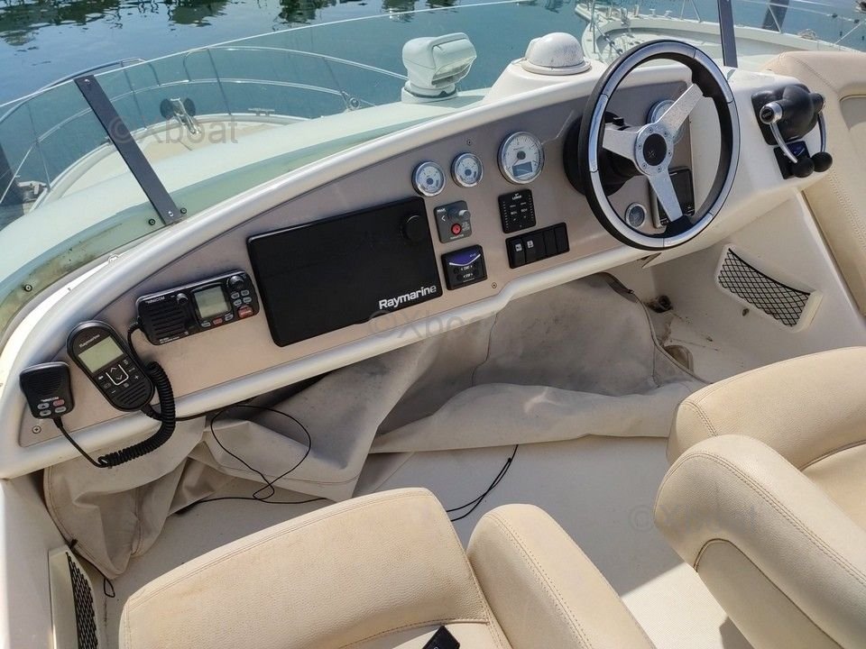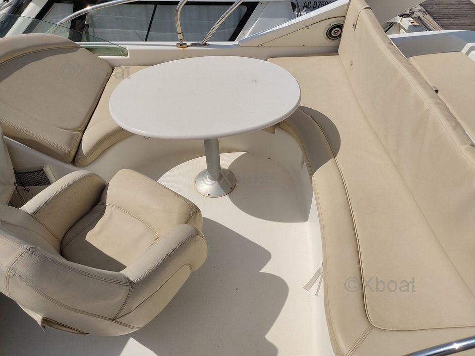 Confort et équipement : Le bateau dispose de deux cabines doubles, une salle de bain avec douche, et un salon spacieux avec une cuisine équipée. Le flybridge offre une vue panoramique et un espace de vie supplémentaire, idéal pour les journées ensoleillées.