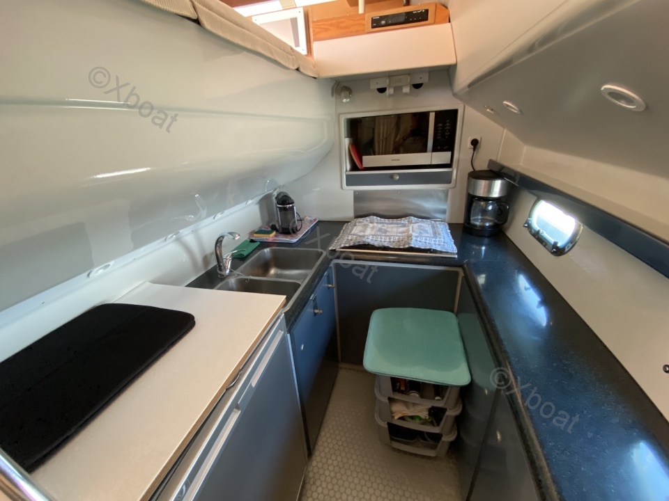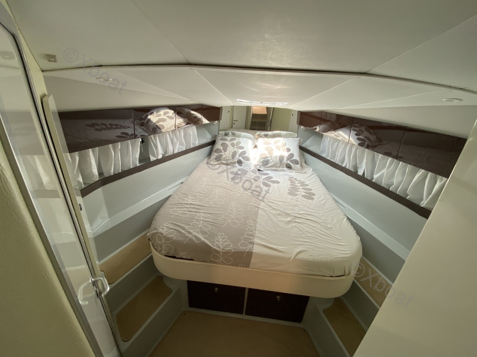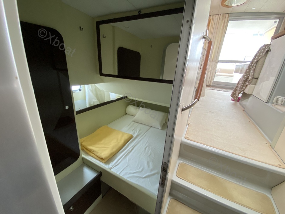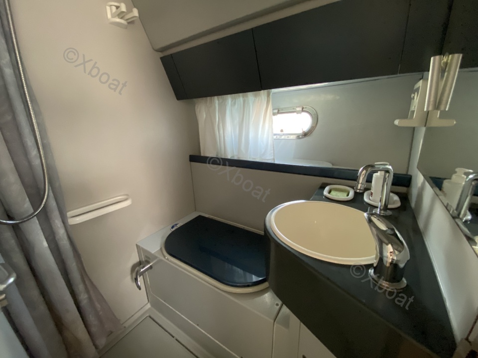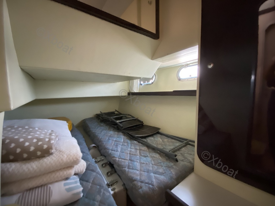 Aménagements intérieurs : Le bateau dispose de trois cabines, dont une cabine principale avec un lit double, et deux cabines d'invités avec des lits simples ou superposés. La salle de bain est équipée de douche séparée et de toilettes électriques. Le salon est spacieux et lumineux, avec une cuisine bien équipée.