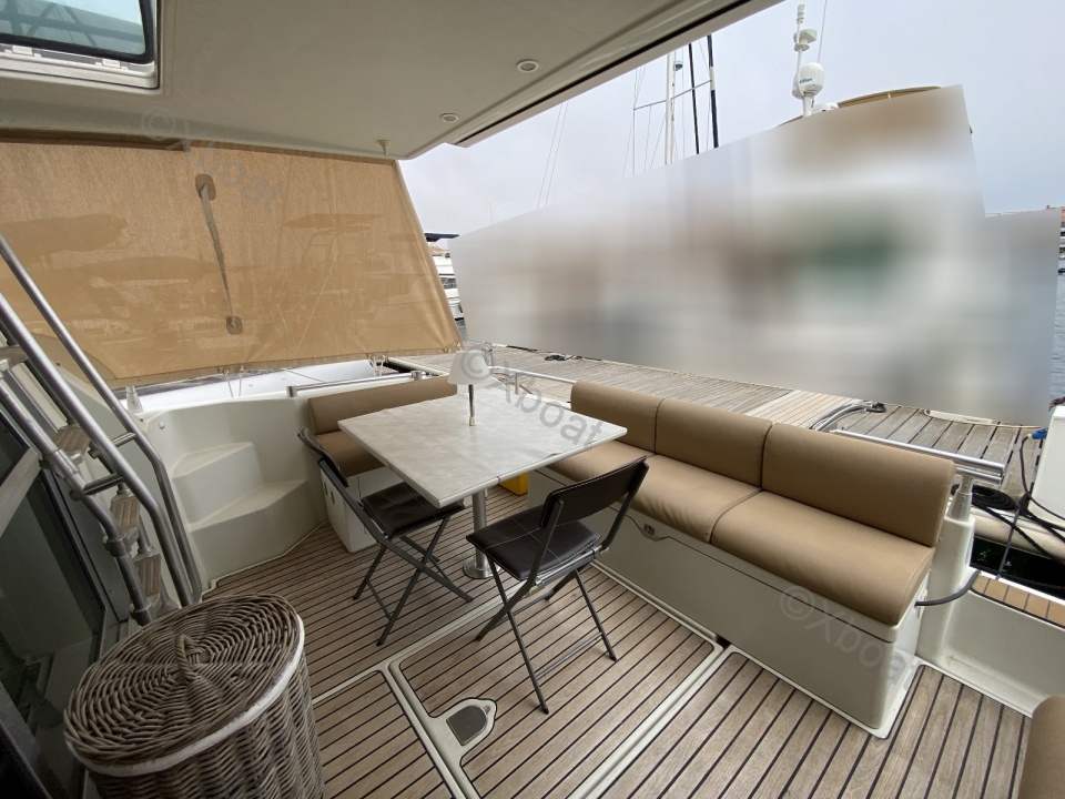 Aménagements extérieurs : Le pont avant offre un espace de détente avec des bancs et des coussins, idéal pour profiter du soleil. Le flybridge est équipé de sièges et d'une table à manger, offrant une vue imprenable sur l'horizon. Le cockpit est spacieux et équipé d'un barbecue et d'un réfrigérateur pour les repas en plein air.