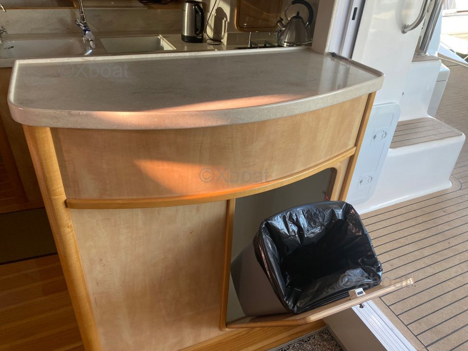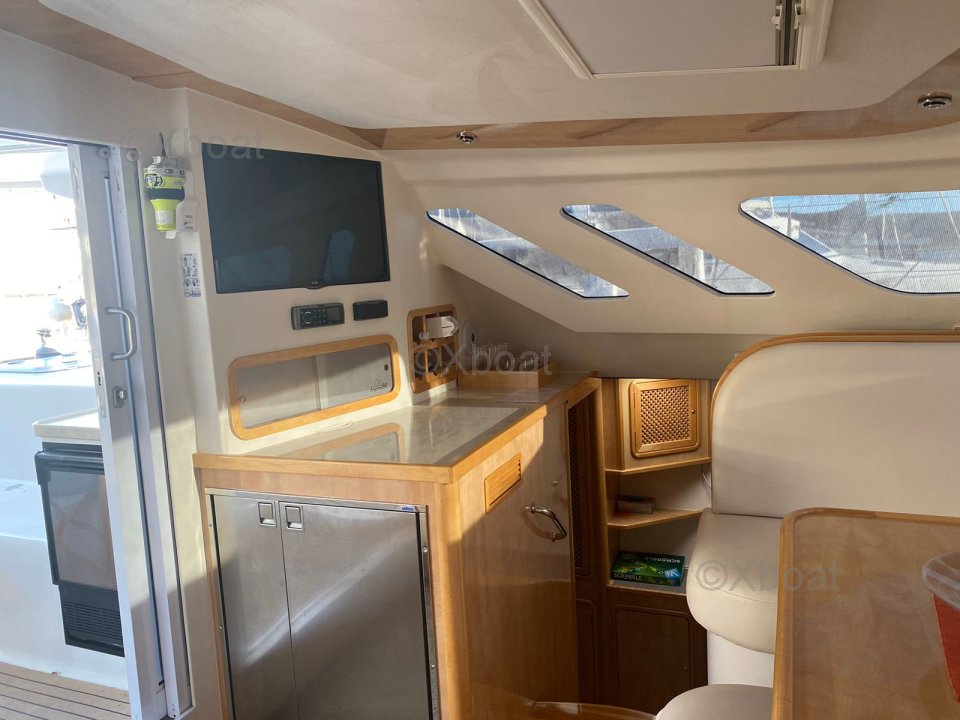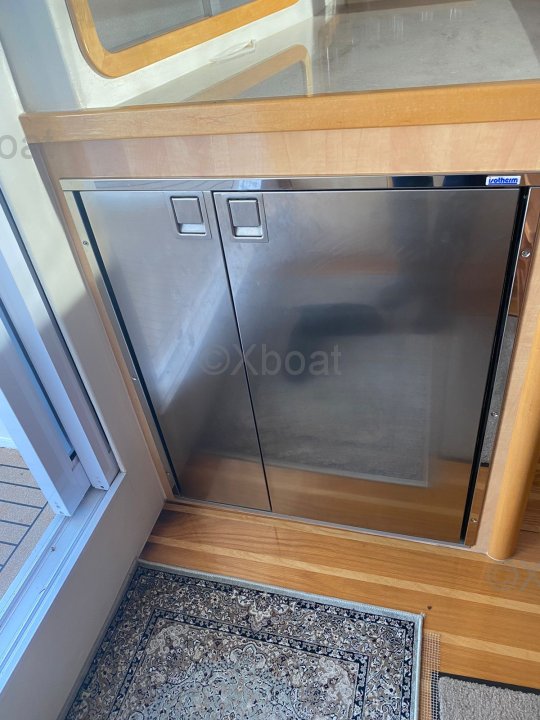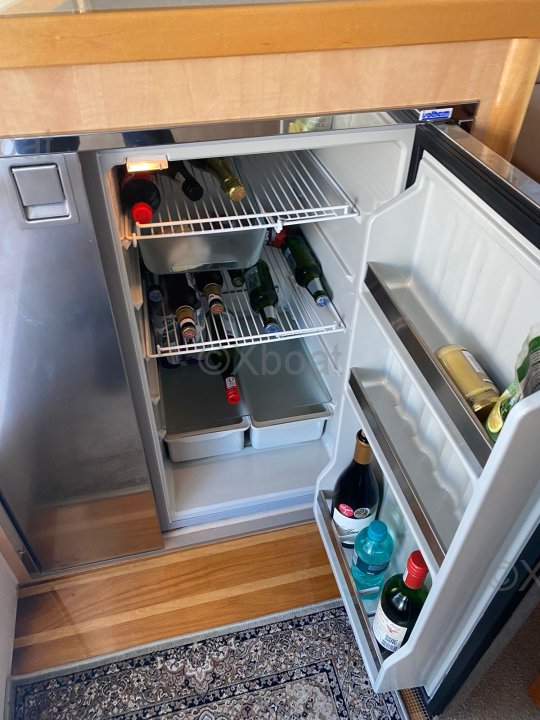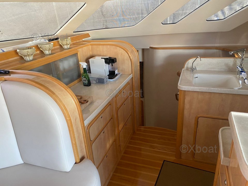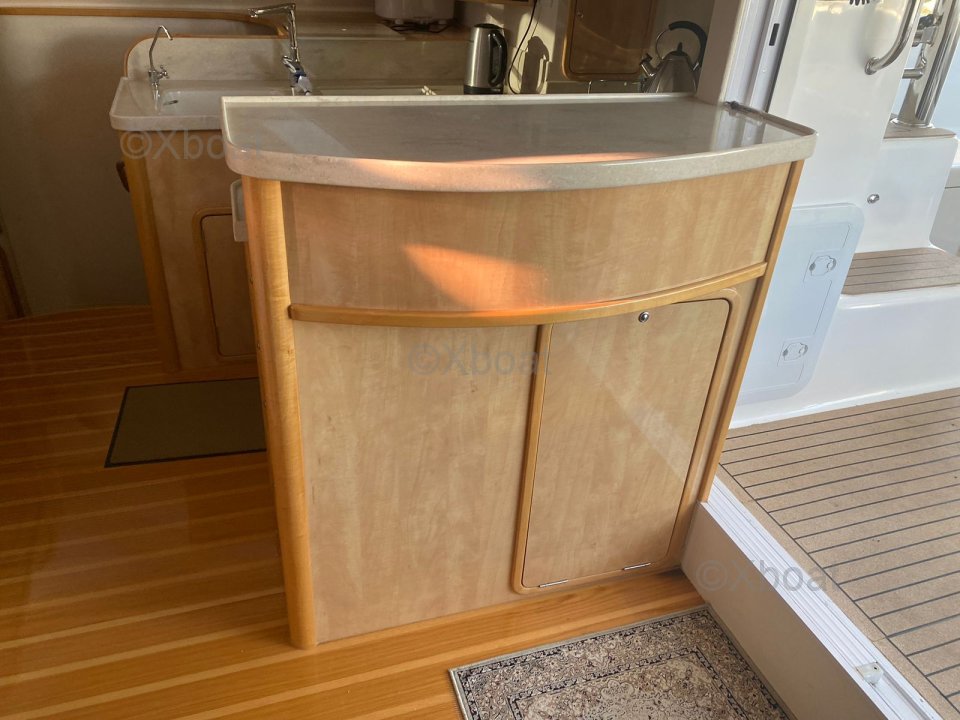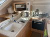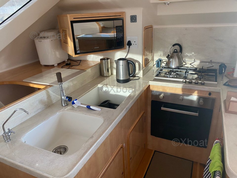 La cuisine est aménagée de manière réfléchie avec un poste café/préparation adjacent et un vaste espace de stockage réfrigéré pour les longs voyages.