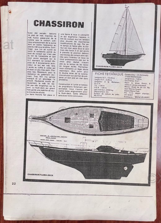 Mon Chassiron Grande Croisière est le modèle le plus connu du chantier Richard, mais cette version Flush Deck est très rare et très probablement unique. La conception générale est celle des carènes classiques qui allient qualités marines et confort à bord où il fait bon vivre. La construction est solide et sérieuse, avec une quille longue et un gréement bien équilibré. Acajou et iroko se partagent l'habillement du pont et de l'intérieur.