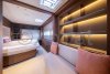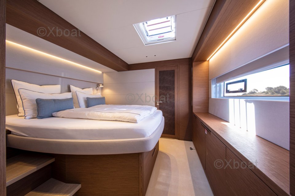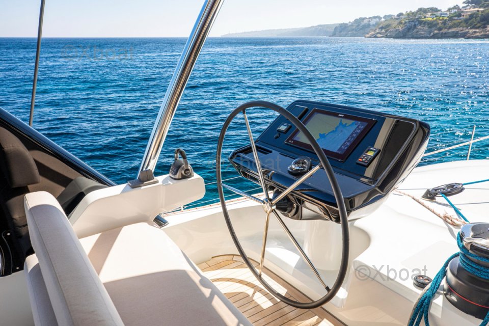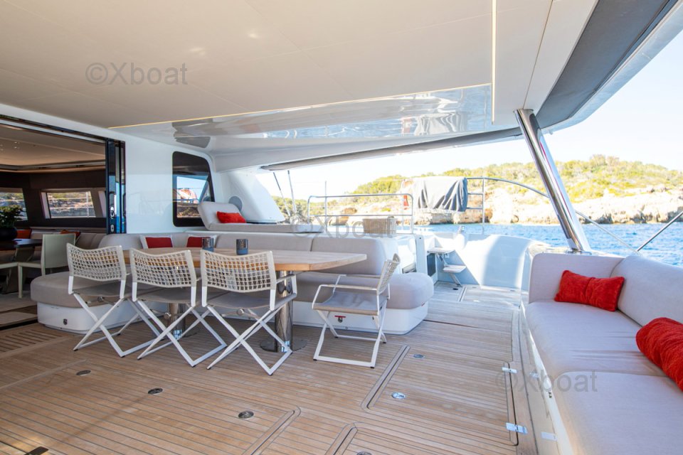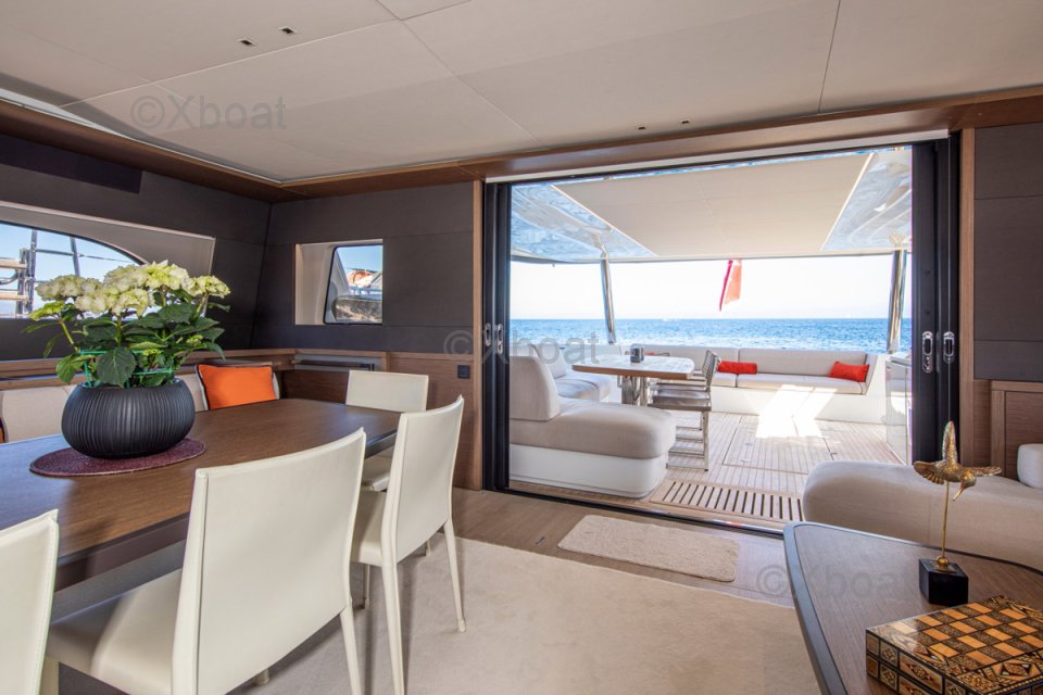 Son cockpit généreux, accessible par de larges jupes, offre une circulation fluide et un accès facile à la plateforme arrière, idéale pour les loisirs nautiques. Conçu par Nauta Design, son intérieur en bois Alpi est baigné de lumière naturelle grâce aux vastes baies vitrées et aux puits de lumière. Le carré panoramique propose un grand espace salon, une table à manger et un bar, tandis que la cuisine en coursive permet discrétion et efficacité.