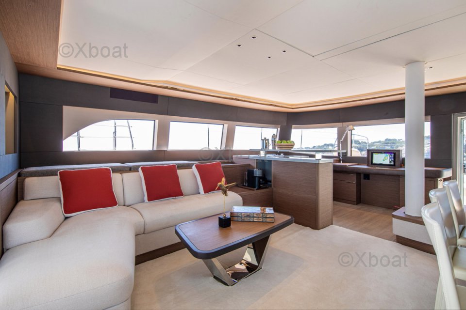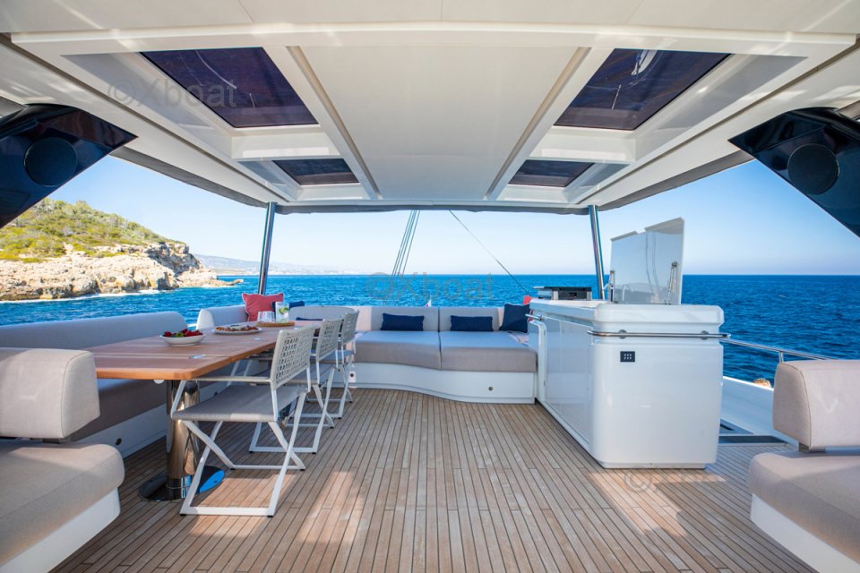 - Flybridge : Postes de barre, salon panoramique, bar avec plancha et espace repas
