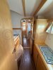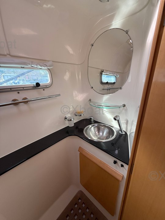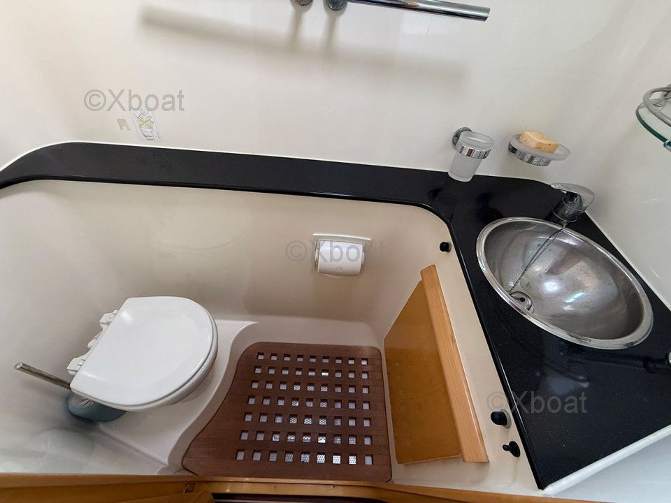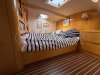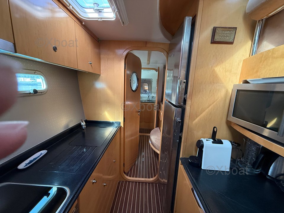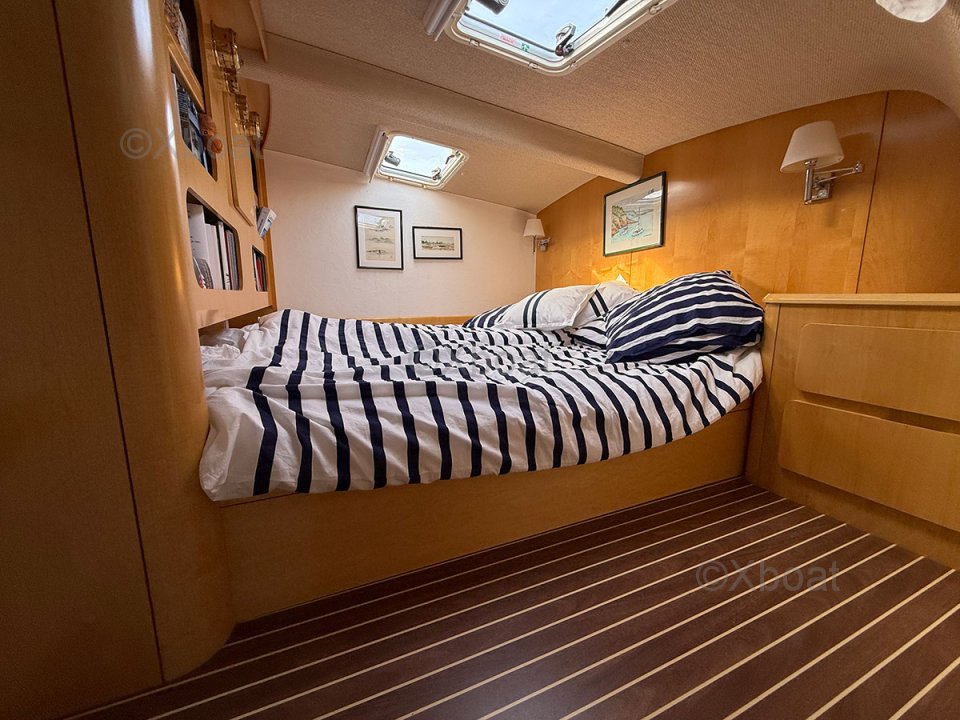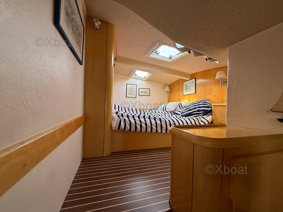 À l’extérieur, les deux bossoirs inox supportent l’annexe, tandis que le bimini protège efficacement le cockpit latté teck. La voilure est complétée par un Code 0 et un gennaker, offrant polyvalence et performance aux allures portantes. Côté confort, la climatisation, le chauffage indépendant et les panneaux solaires témoignent d’un équipement complet et cohérent, pensé pour l’autonomie et les longues navigations.