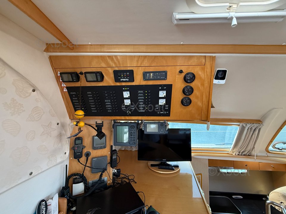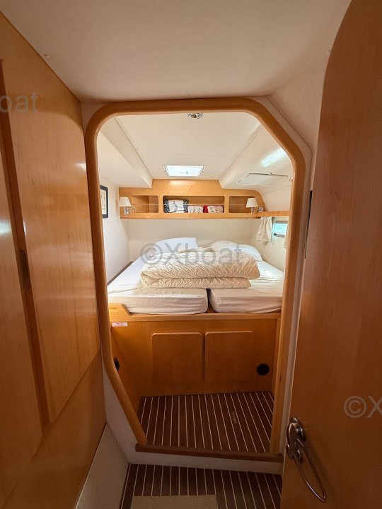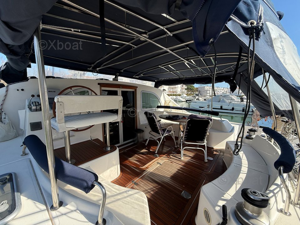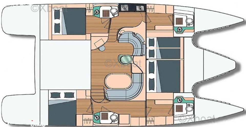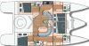 Cette version Propriétaire propose une cabine centrale accessible par l’avant tribord, une cabine à bâbord avec deux lits simples superposés, ainsi que deux cabines doubles invités situées à l’arrière. La cuisine, installée dans la coursive bâbord, est lumineuse et ouverte sur le carré, créant un espace convivial et fonctionnel. Les formes arrondies du mobilier, l’espace détente, la table à cartes positionnée à l’entrée et le poste de barre bien protégé dans le cockpit sont autant d’éléments qui confirment la vocation voyage de ce catamaran.